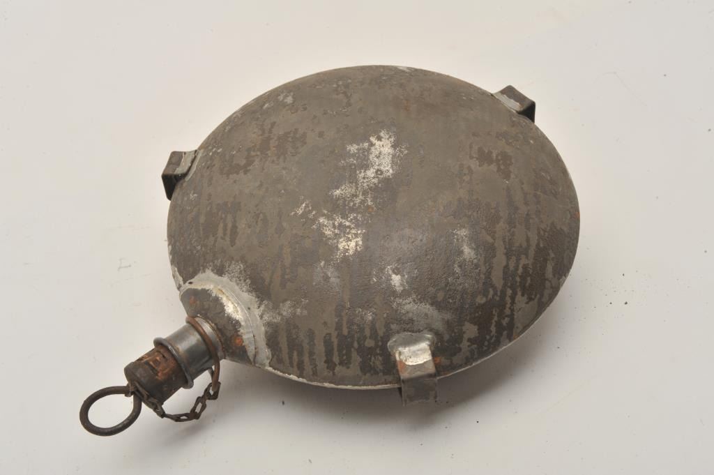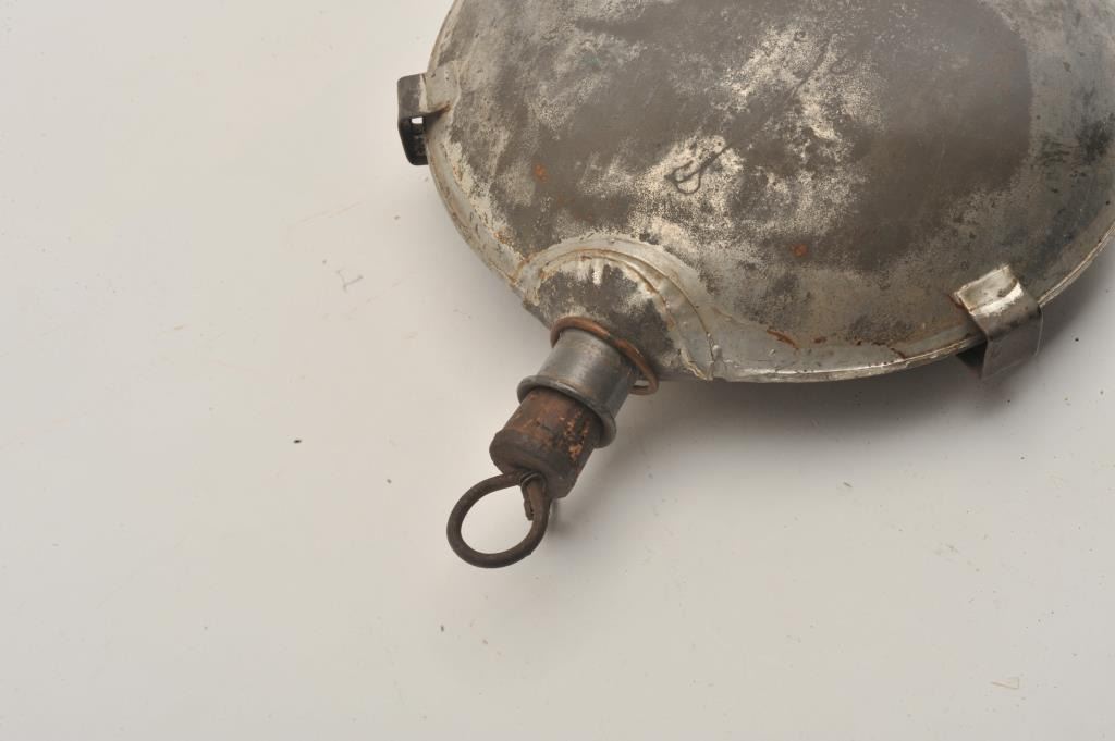 Tin canteen 1862-63 (Ref Page 181 #208 on inventory, No book title listed). No cover but stopper and chain is retained. Good condition. Est.: $100-200