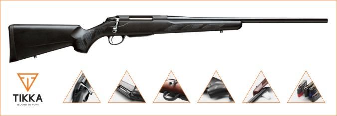 The TIKKA T3 LITE 300 WIN MAG BOLT ACTION RIFLE offers all the features and benefits of Tikka’s popular Whitetail series, plus a new look. At the heart of the T3 is the hyper accurate cold hammer forged barrel, sturdily anchored to a silky smooth action. The trigger is crisp and positive, and is easily adjustable for weight of pull (2-4 lbs). Like other T3s, they are guaranteed to put three shots inside an inch at 100 yards. The Tikka 3 features: 24 ?" blue barrel & black synthetic stock, 3+1 capacity, single-stage trigger w/two-position safety. It measures 44 ½” in length and weighs 6 lbs. 6 oz. www.tikka.fi/rifles/tikka-t3/t3-lite