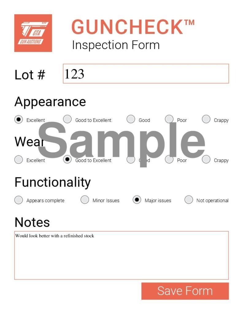 We are the only firearms auction company providing GUNCHECK. Every used firearm is inspected by a licensed and registered gunsmith who issues a report indicating the overall Appearance, Wear and Functionality of these firearms.