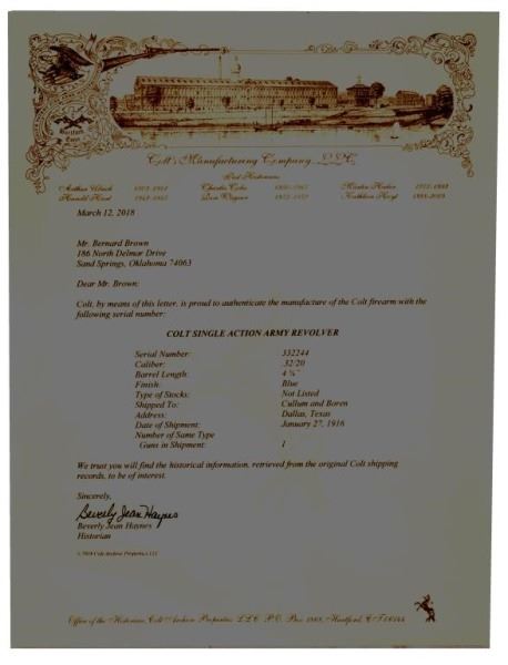 Lot 250 Colt Model 1873 SA .32-20 Dallas Texas Shipped