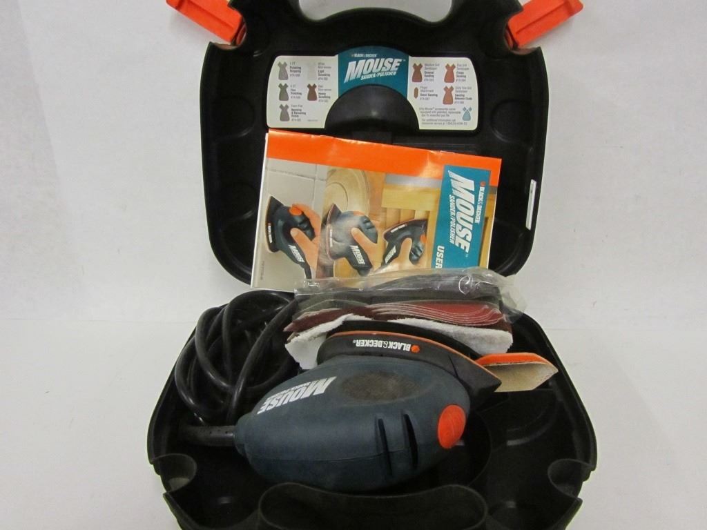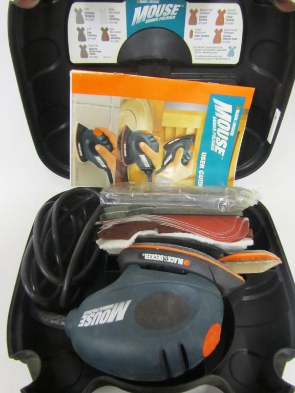 BLACK & DECKER MOUSE SANDER/POLISHER TOOL WITH 8 DIFFERENT GRITS OF SANDPAPER AND SEVERAL POLISHERS AND SCRUBBERS AS WELL AS THE USER MANUAL.