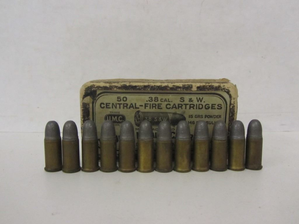 12 ROUNDS OF 38 S&W AMMO AND ONE PIECE OF BRASS IN U.M.C. BOX