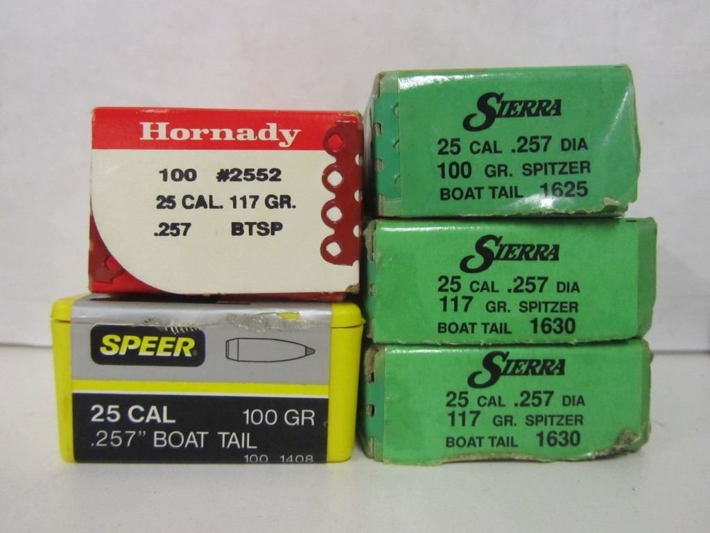 ONE BOX OF HORNADY 25CAL 117GR BOAT TAIL SOFT POINT BULLETS, TWO BOXES OF SIERRA 25CAL 117GR SPITZER BOAT TAIL BULLETS, ONE BOX OF SIERRA 25CAL 100GR SPITZER BOAT TAIL BULLETS, ONE BOX OF SPEER 25CAL 100GR BOAT TAIL SOFT POINT BULLETS.