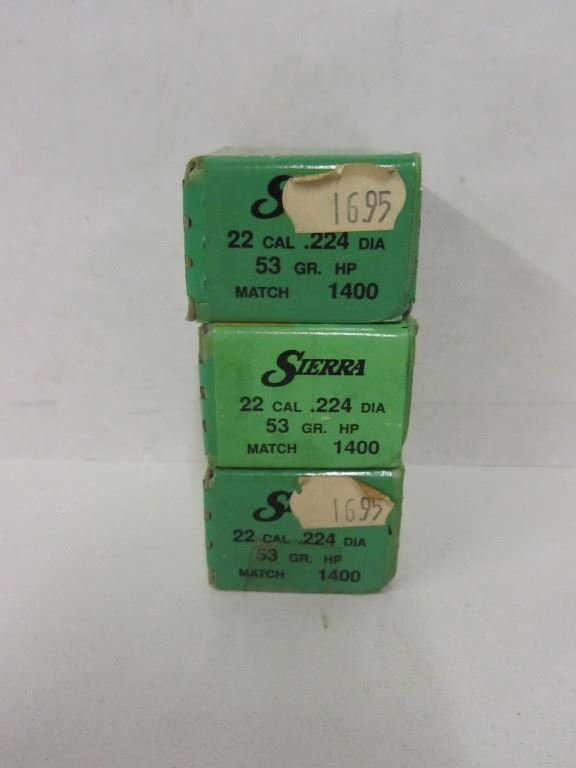 THREE BOXES OF SIERRA 22CAL 53GR HOLLOW POINT BULLETS