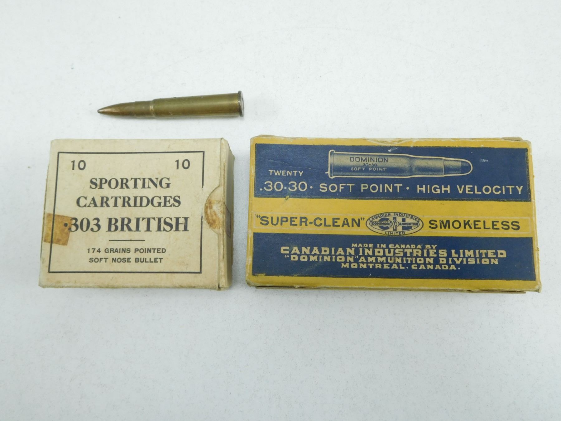 ASSORTED ANTIQUE AND WWI/WWII ERA AMMO , 28 RNDS INCLUDES DOMINION 30-30 170 GRAIN SP SUPER CLEAN, AND 303 BRITISH HEAD STAMPED INCLUDE 1911, 1943 & 1944