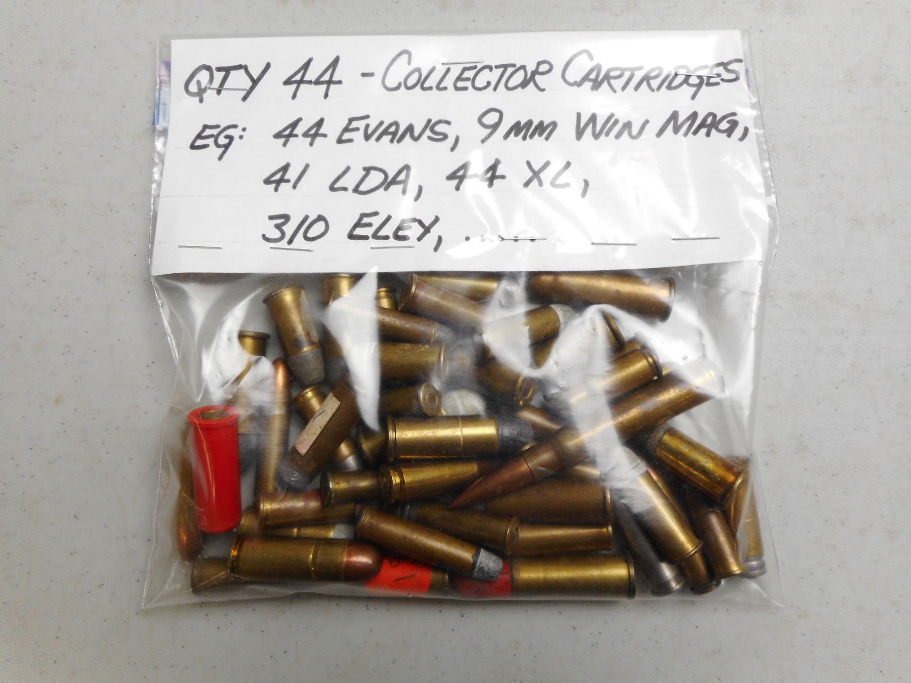 ASSORTED COLLECTORS/ANTIQUE AMMO , APPROX 44 RNDS INCLUDES 44 EVANS, 9MM WIN MAG, 41 LDA, 44XL, 310 ELEY, SEE PHOTO