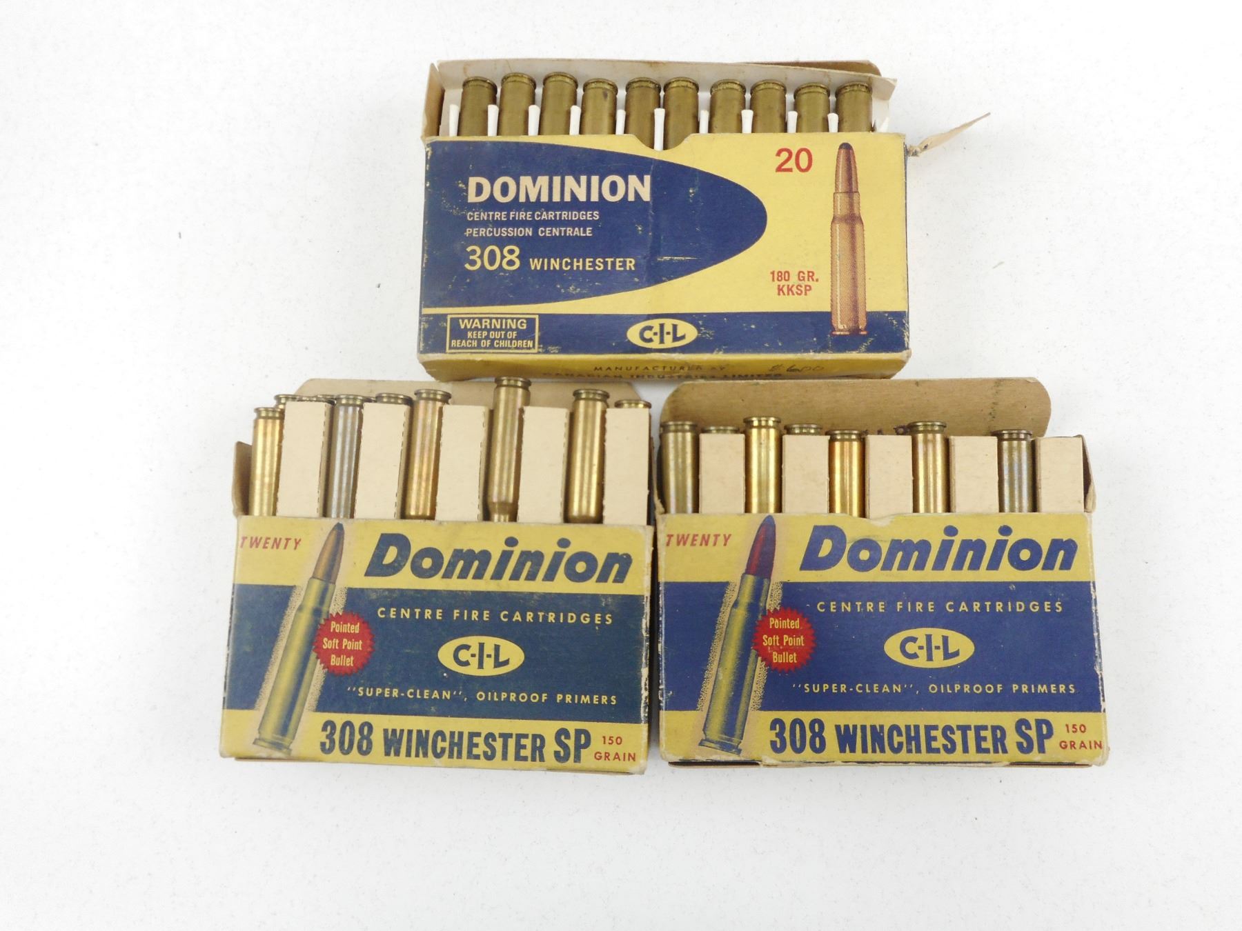 DOMINION 308 WIN AMMO & RELOADS , 65 RNDS TOTAL: INCLUDES 25 RNDS & 14 BRASS DOMINION 150 GRAIN SP 20 RNDS 308 RELOADS