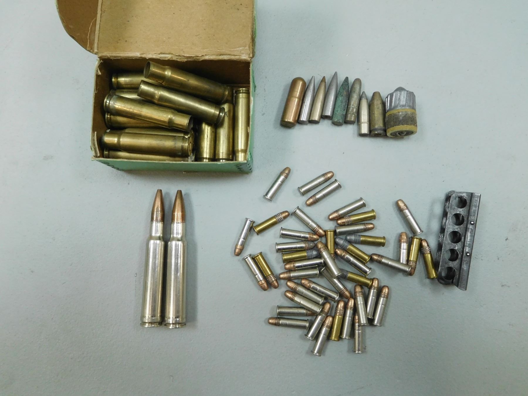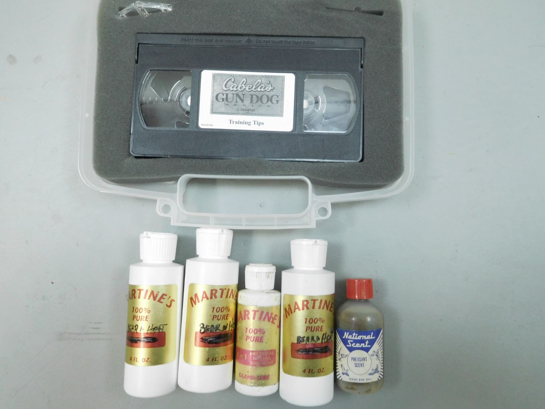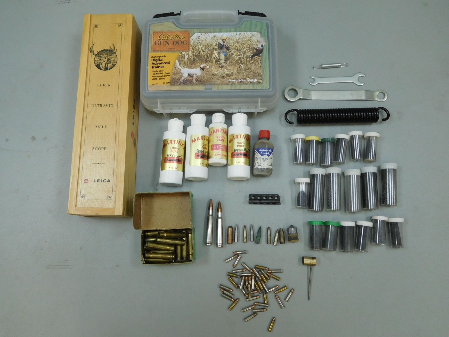 ASSORTED LOT , APPROX. 52 RNDS TOTAL ASSORTED AMMO, PRIMED BRASS, & BULLETS 1 LBS ASSORTED SHOT & LEAD, HUNTING ACCESSORIES: SCENTS, CABELAS GUN DOG TRAINING TIPS VHS, WOODEN LEICA SCOPE BOX FOR MODEL 3.5-10X 42MM