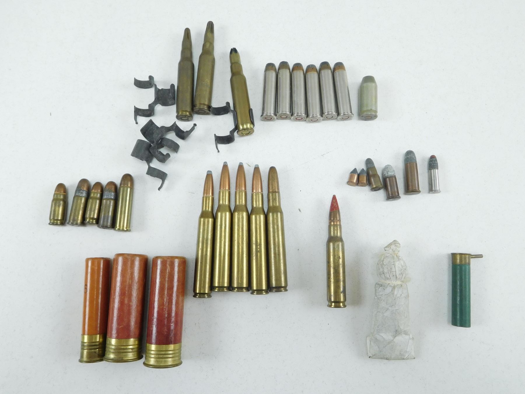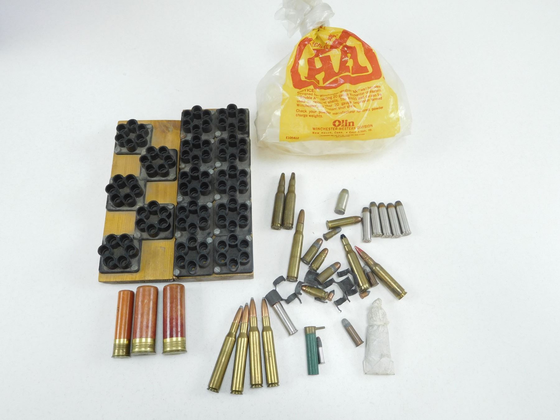 ASSORTED AMMO & RELOADING , 28 RNDS ASSORTED INCLDES 10 GA, 30-06, 357 MAG, 30 LUGER, LOADING BLOCKS & WADDING