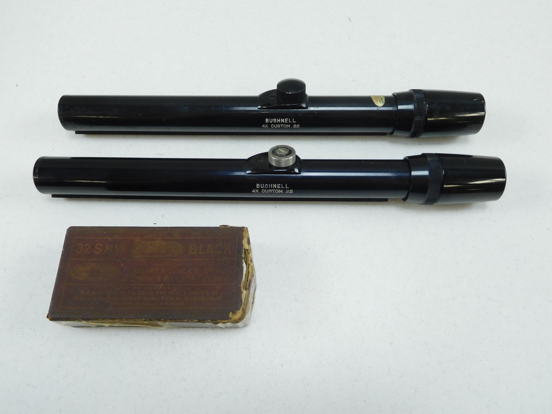 32 S&W AMMO & SCOPES , APPROX. 39 RNDS INCLUDES BLACK IN CIL 32 S&W BLACK BOX, (2) BUSHNELL BANNER 4 X CUSTOM .22: (1) WITH GOOD VISIBILITY BUT SLIGHT ERROR IN RETICLE, (1) BLURRED VISIBILITY
