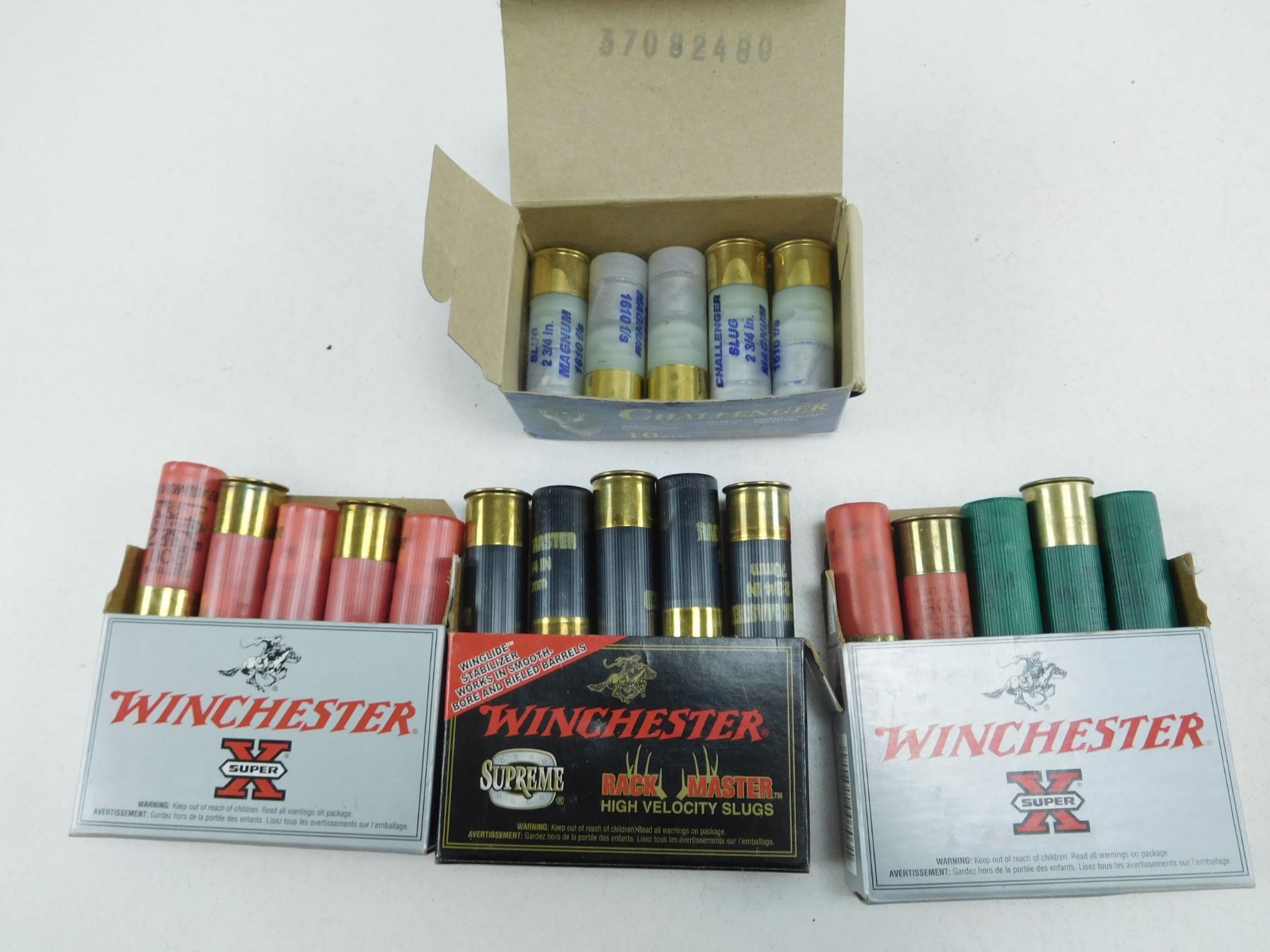 ASSORTED 12 GA 2 3/4" SHOT & SLUGS AMMO , 20 RNDS INCLUDES WINCHESTER RACKMASTER HIGH VELOCITY SLUGS, CHALLENGER MAGNUM SLUGS AND WINCHESTER 00 BUCK