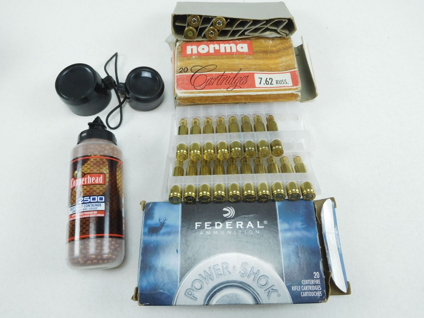 ASSORTED AMMO LOT , 22 RNDS INCLUDES FEDERAL 308 WIN 180 GRAIN SP & NORMA 7.62 RUSSIAN 180 GRAIN SP & (1) BOTTLE COPPERHEAD 2500 EASY POUR & BIKINI COVER