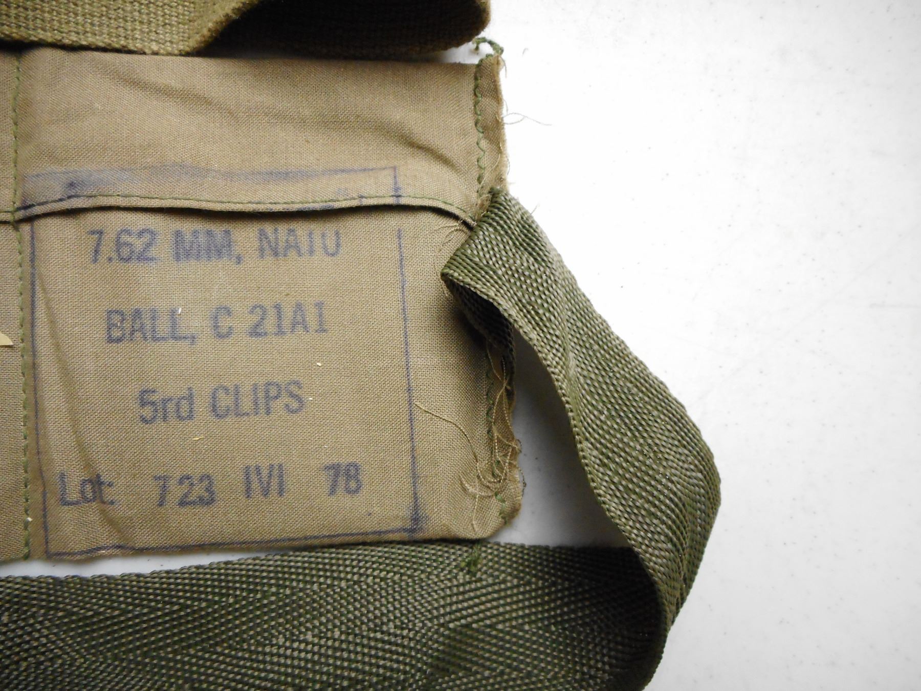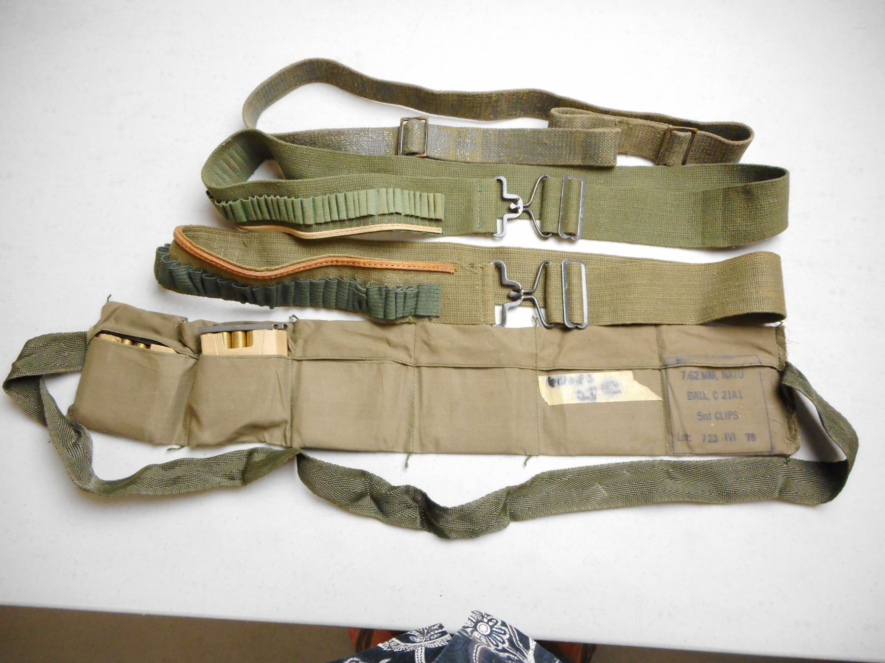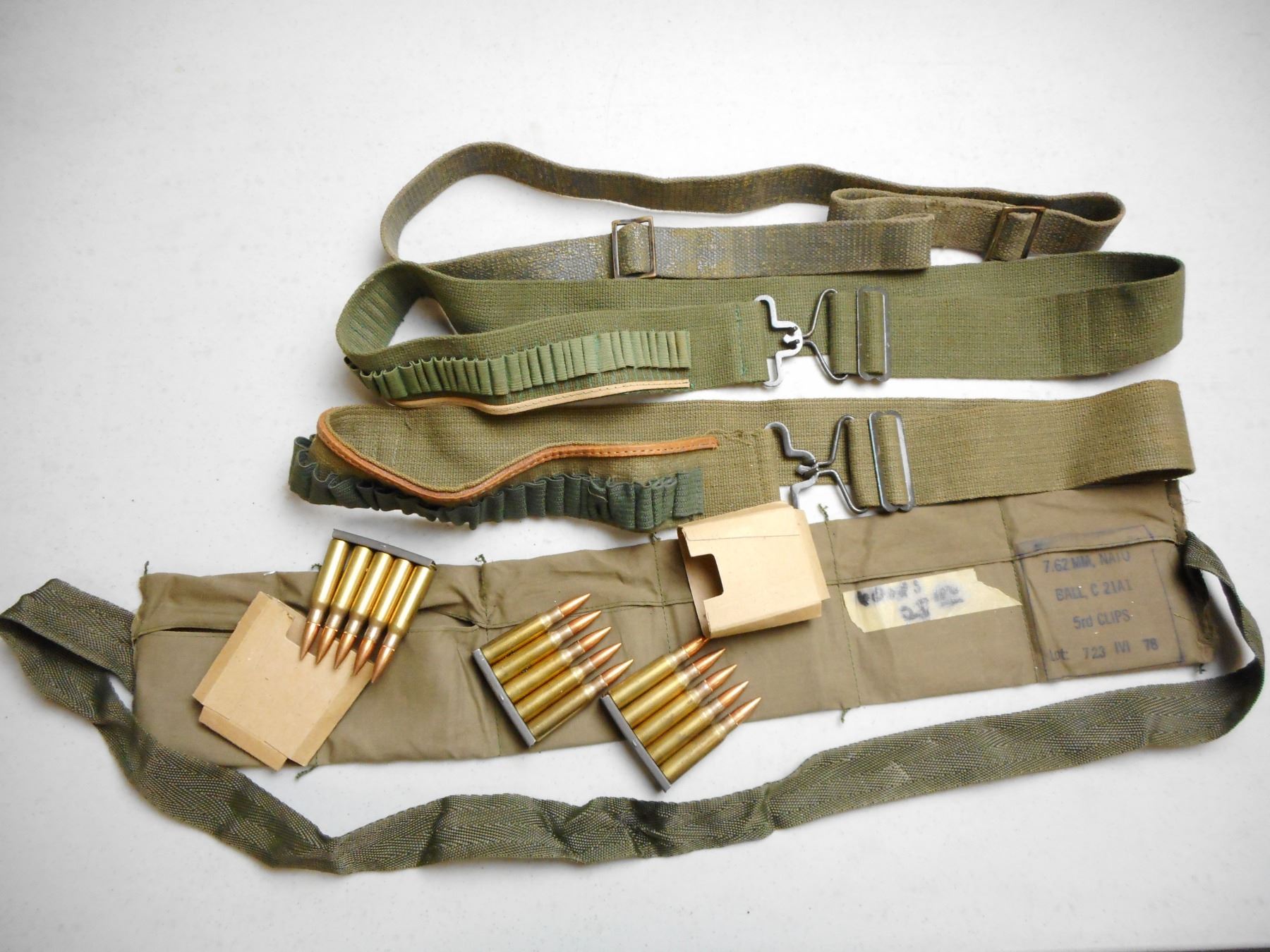 7.62 MM NATO AMMO & SLINGS , 15 RNDS AMMO ON STRIPPER CLIPS, (2) GREEN CANVAS AMMO BELTS, (1) WAXED CANVAS SLING