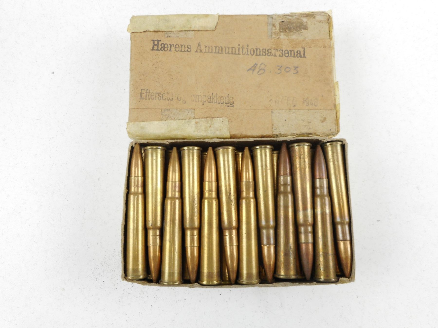 WWII 303 BRITISH AMMO , 48 RNDS HAERENS AMMUNITIONS ARSENAL BOX STAMPED 20 FEB 1948