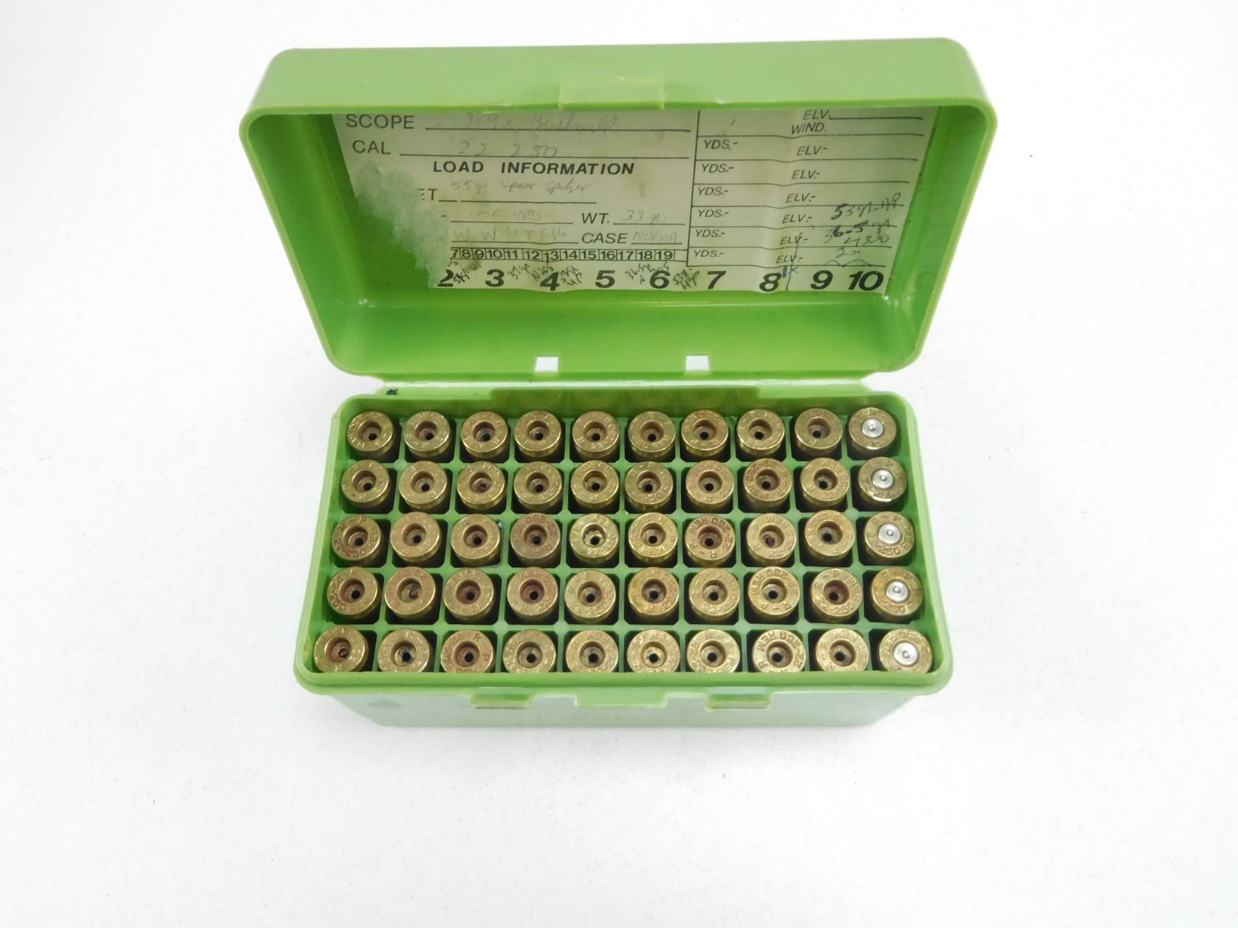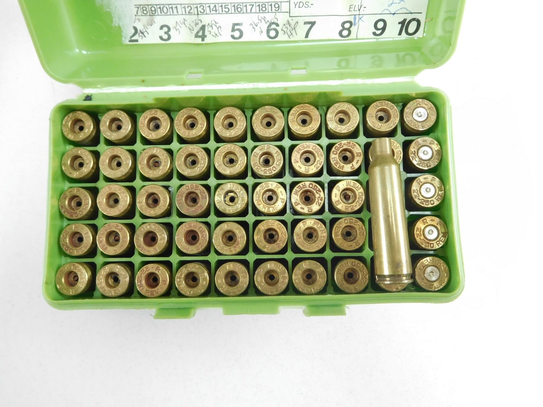 REMINGTON 22-250 BRASS , 50 BRASS: 5 FIRED, 45 NEW, IN MTM CASE