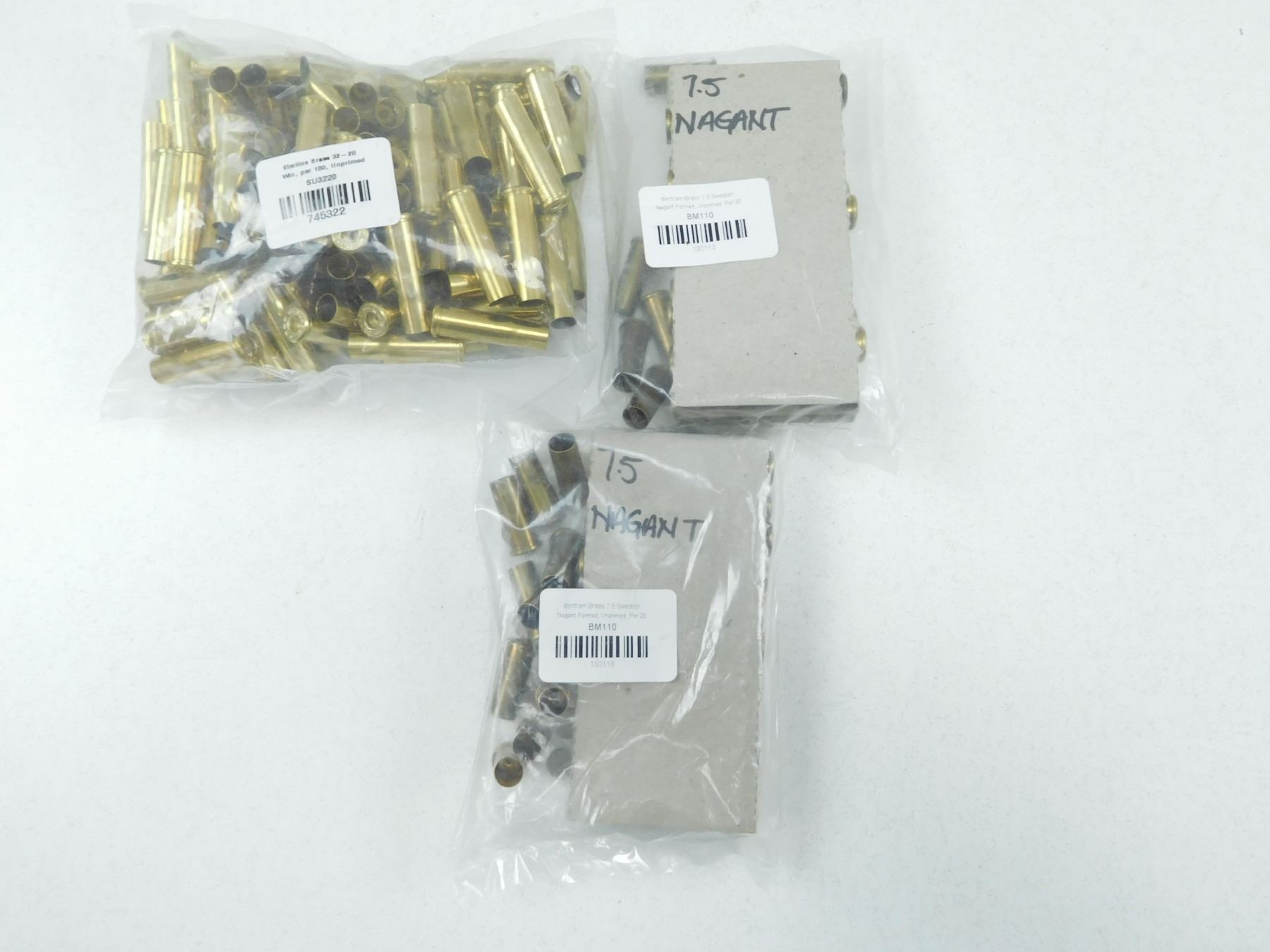 ASSORTED UNPRIMED BRASS , 140 BRASS INCLUDES 32-20 WIN, NEW & 7.5 SWEDISH NAGANT, NEW