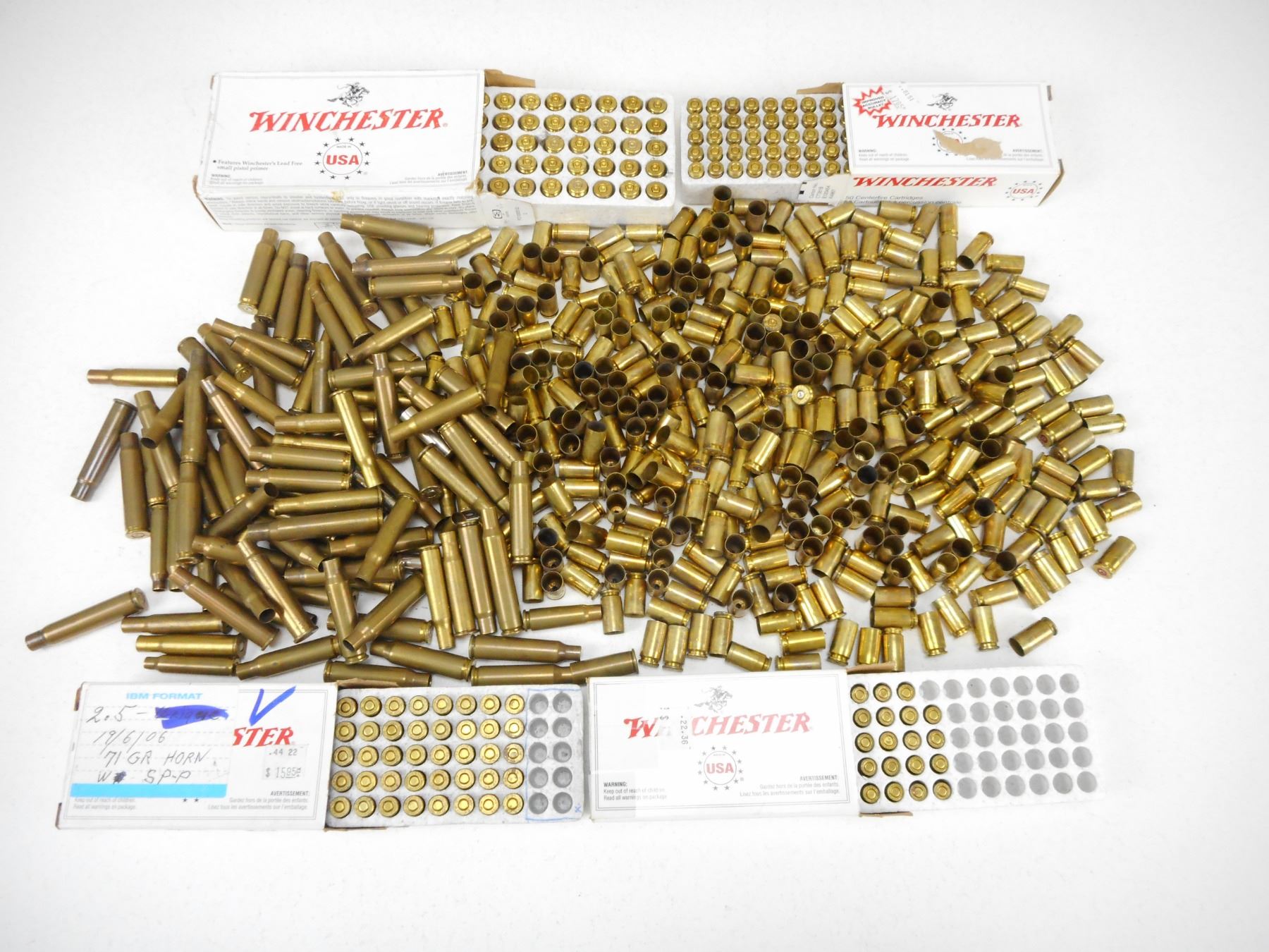 ASSORTED PRIMED & UNPRIMED BRASS , 3.5 KG INCLUDES WINCHESTER 32 AUTO & 45 AUTO, & 45 S&W BRASS