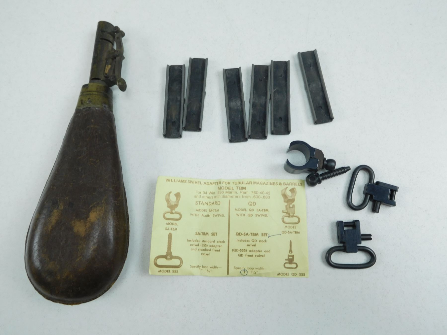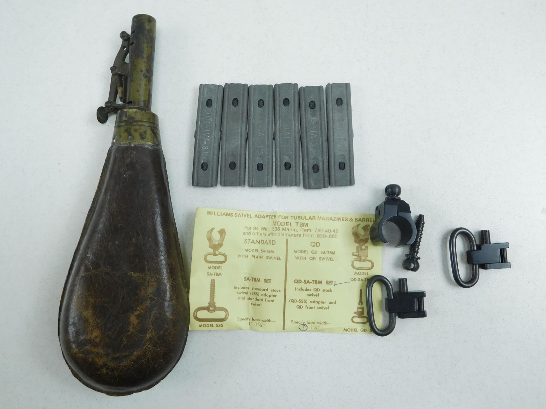 ASSORTED LOT , (1) BRASS & LEATHER SHOT FLASK, (6) STRIPPER CLIPS FOR .308 (7.62) AMMO, (1) WILLIAMS SWIVEL ADAPTER FOR TUBULAR MAGAZINES & BARRELS