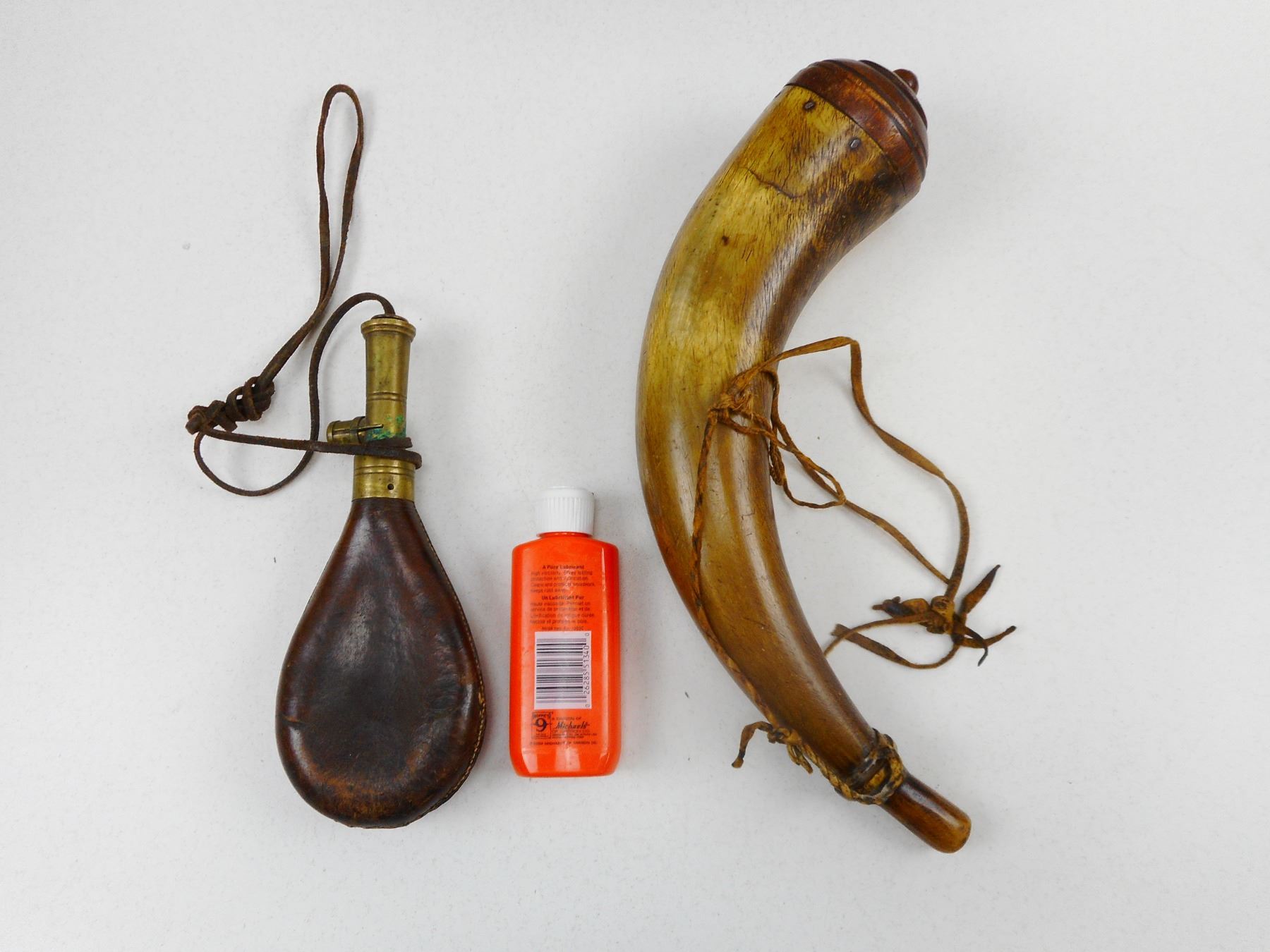 ASSORTED RELOADING TOOLS , (1) POWDER HORN, (1) LEATHER & BRASS POWDER FLASK, (1) HOPPE'S LUBRICATING OIL, LOT OF 3