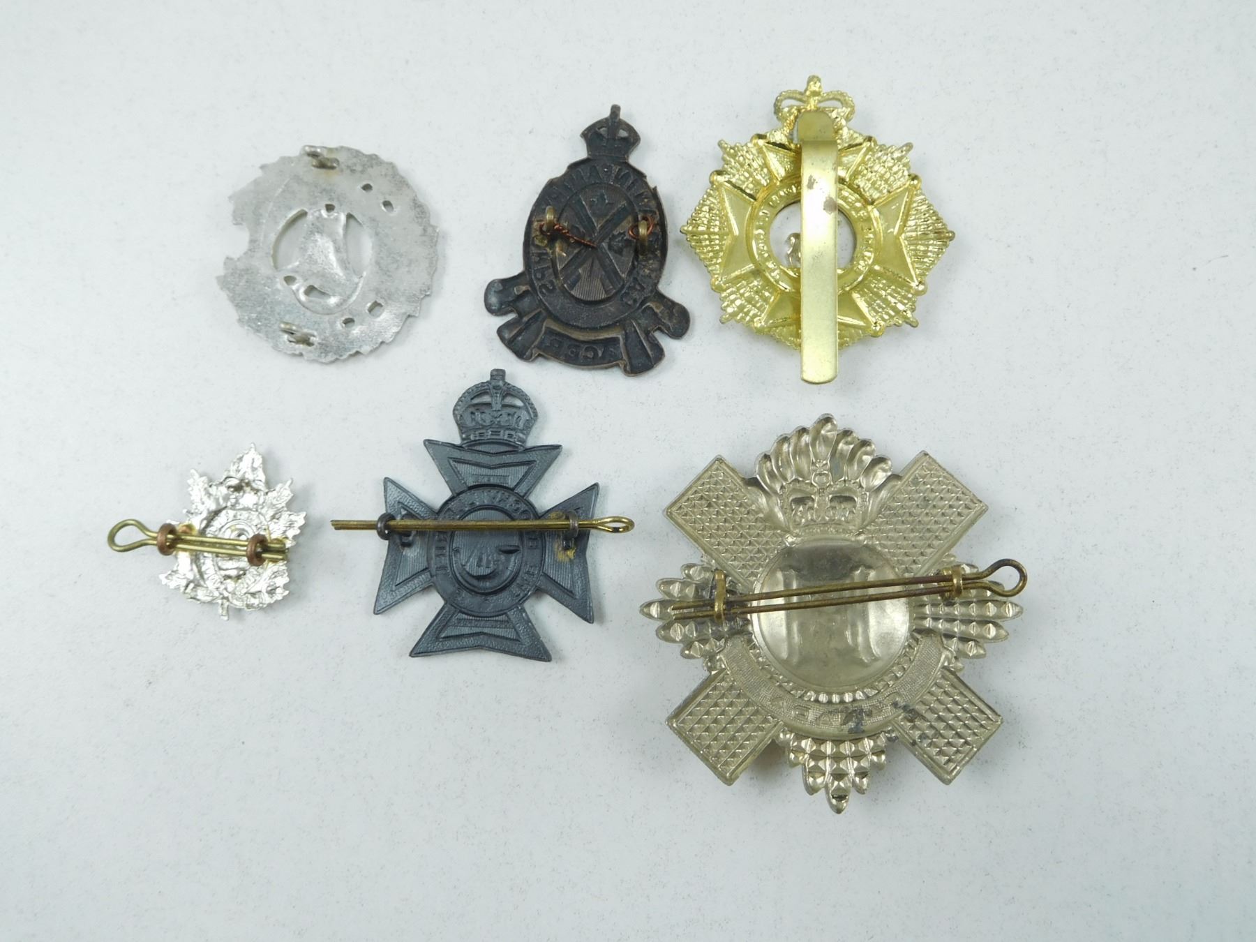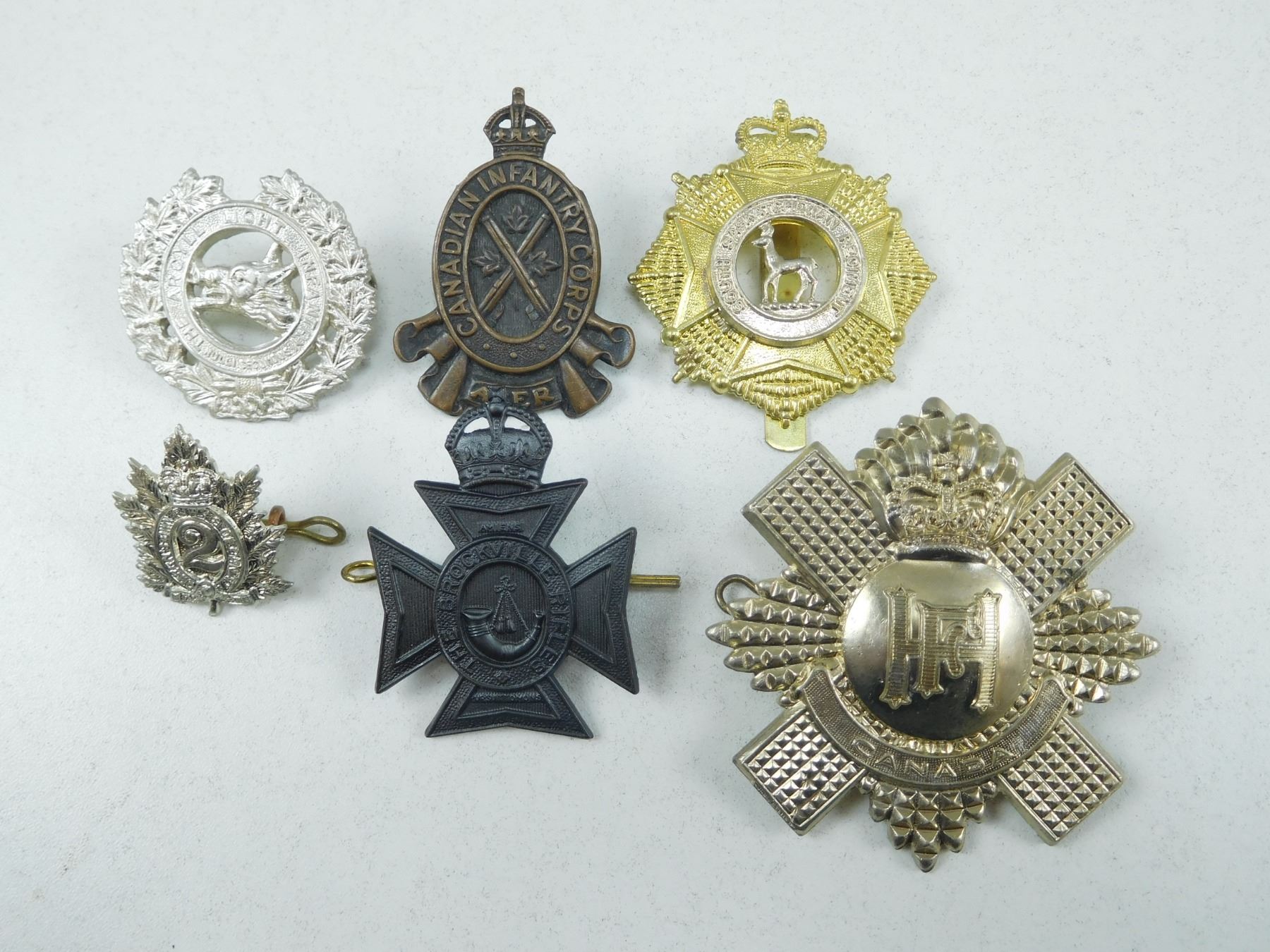 ASSORTED CAP & COLLAR BADGES , INCLUDES BRASS CANADIAN INFANTRY CORPS LUG BACK NO PIN, QUEENS OWN RIFLES LUG BACK WITH PIN, BROCKVILL RIFLES LUG BACK WITH PIN, SOUTH SASKATCHEWAN RIFLES SLIDE FASTENER, THE ARGYLL LIGHT INFANTRY LUG BACK NO PIN