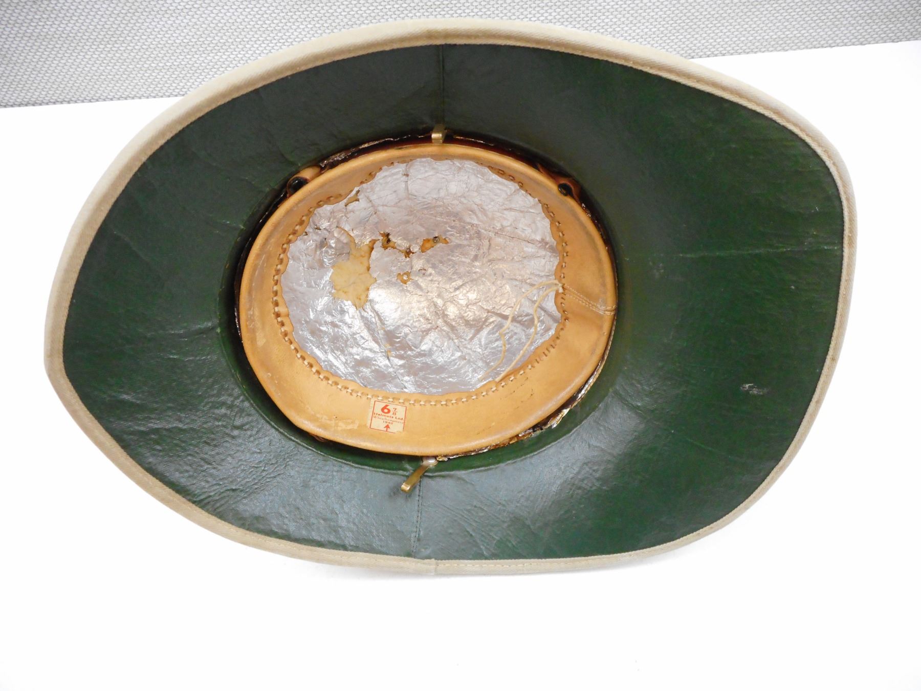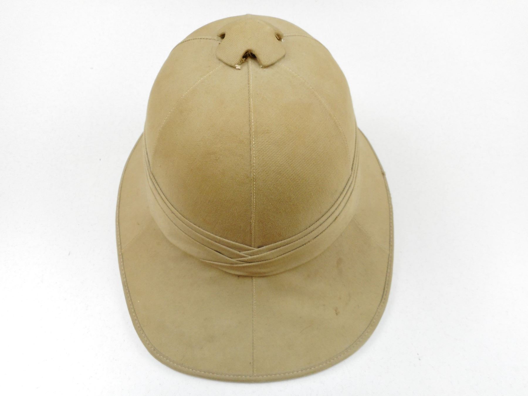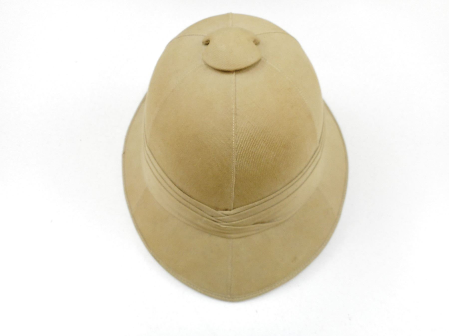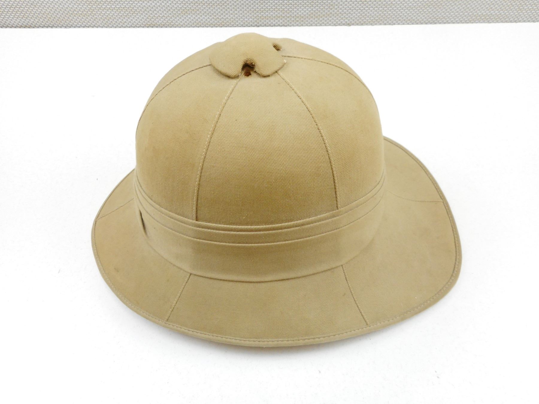 KHAKI PITH HELMET , SCOOP BACK, WITH PUGGAREE, FLAT BUTTON TOP, LABEL INSIDE MARKED 6 7/8 HELMETS LTD WHEATHAMPSTEAD 1940