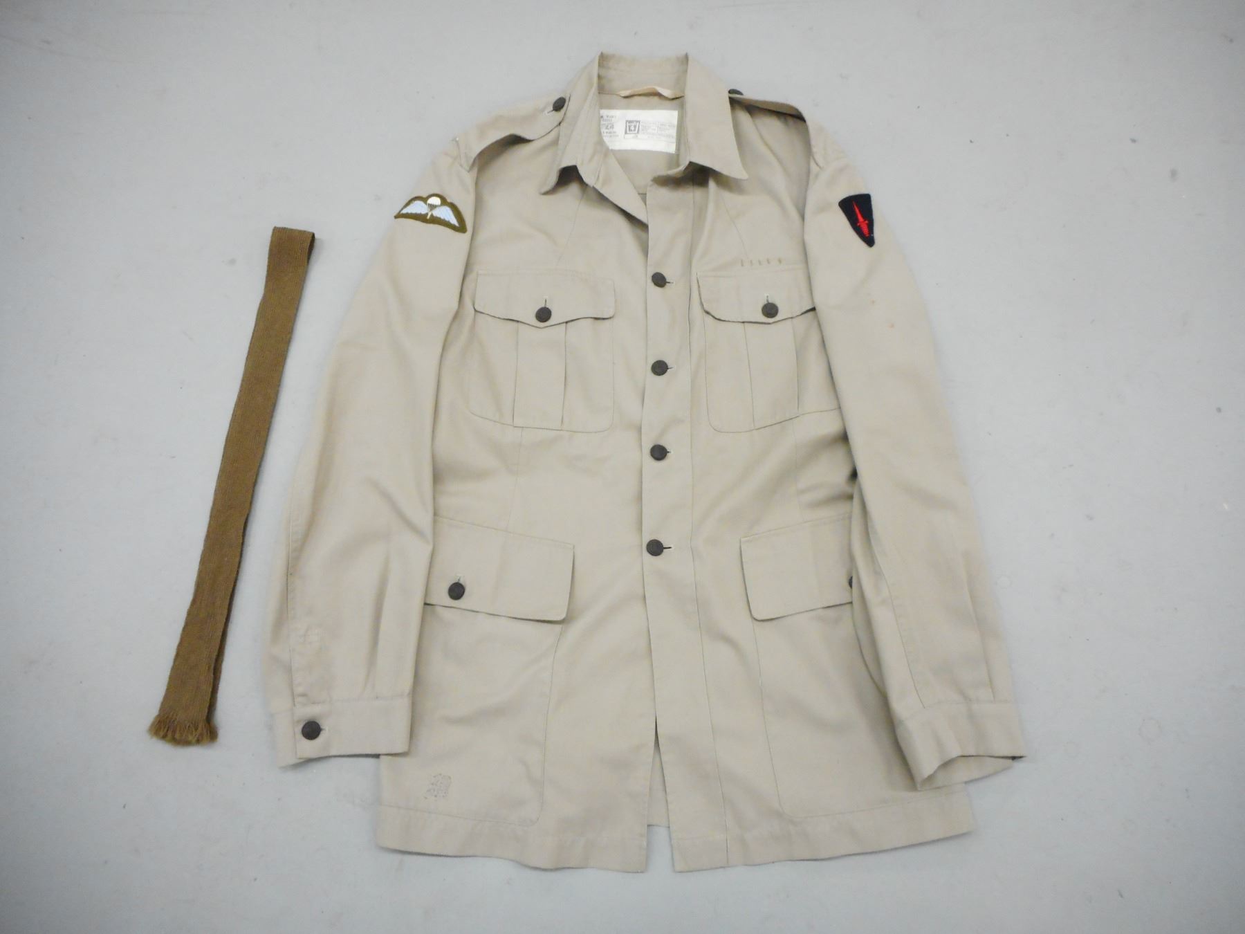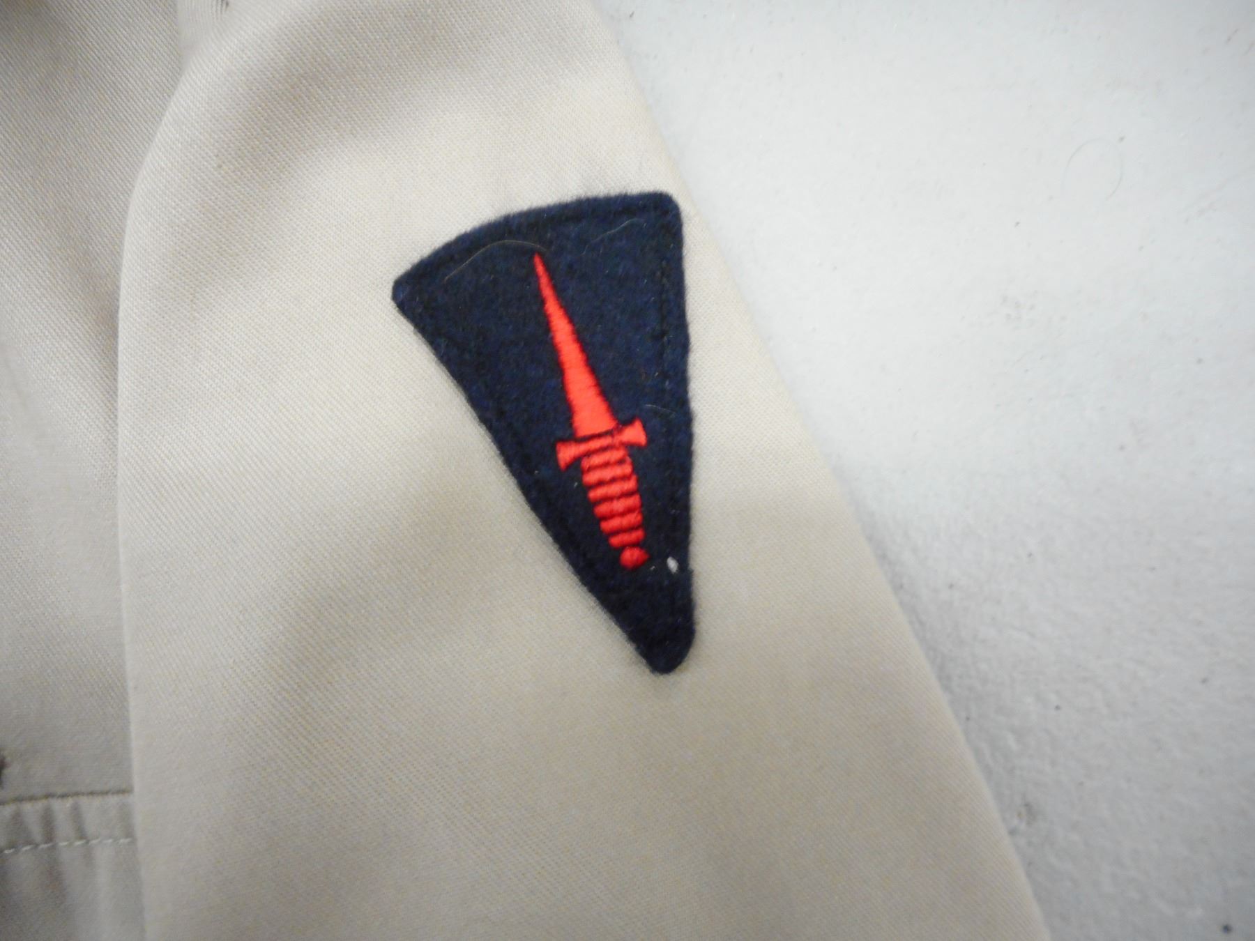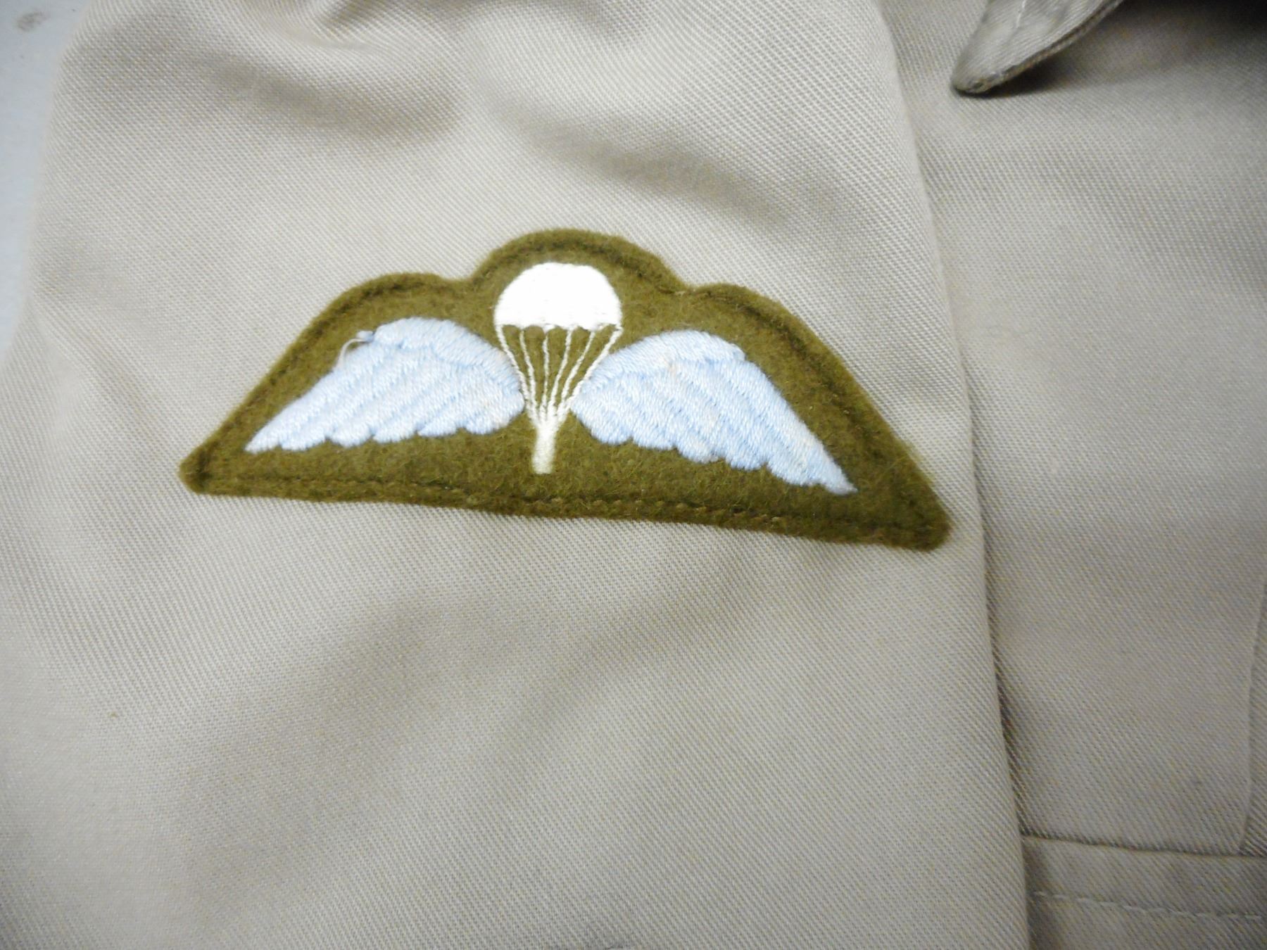 SUMMER KHAKI NO 6 DRESS UNIFORM , SIZE 24 INCLUDES RIFLE REGIMENT BUTTONS, JUMP WINGS SHOULDER BADGE & COMMADO DAGGER SHOULDER BADGE
