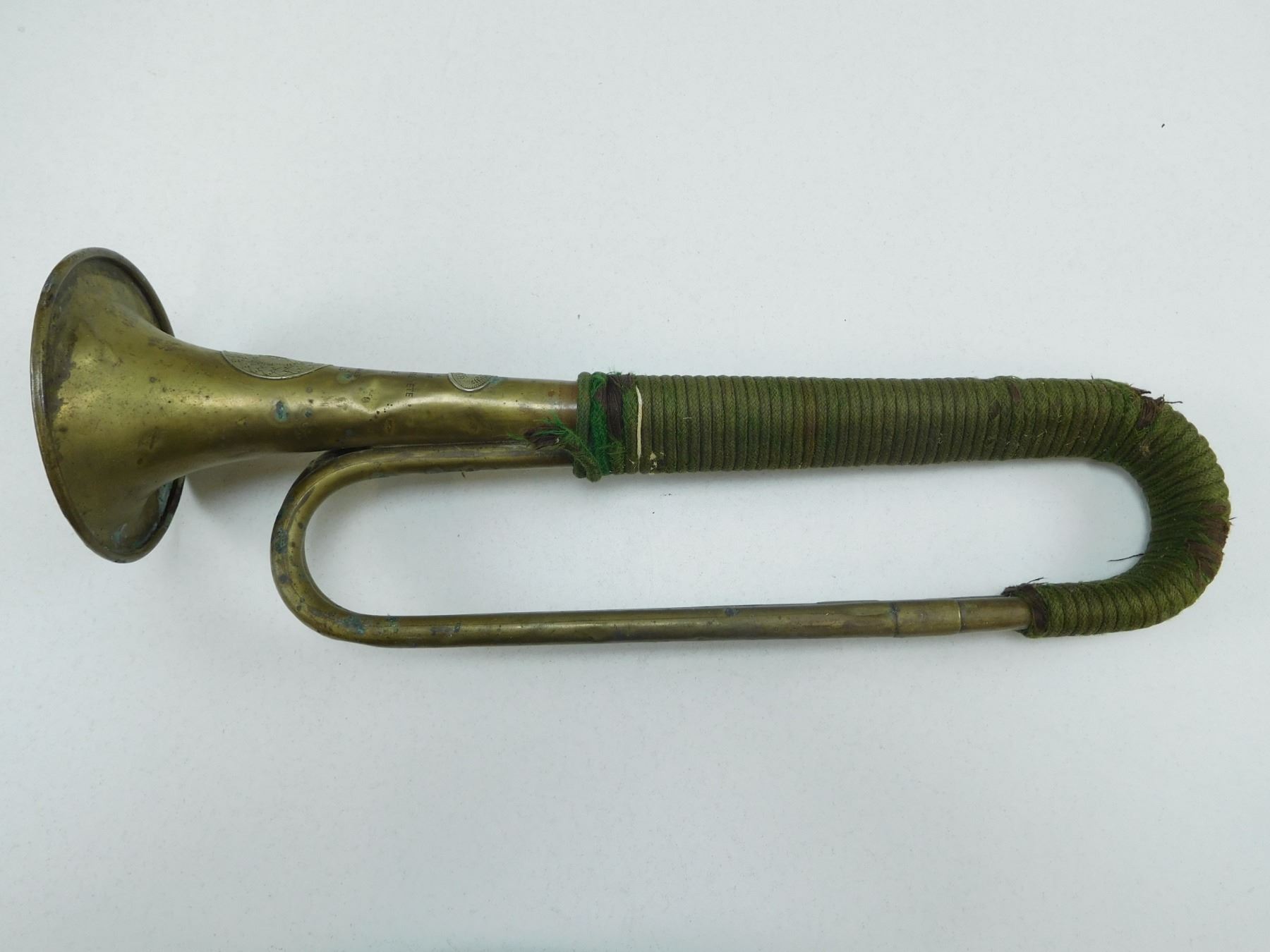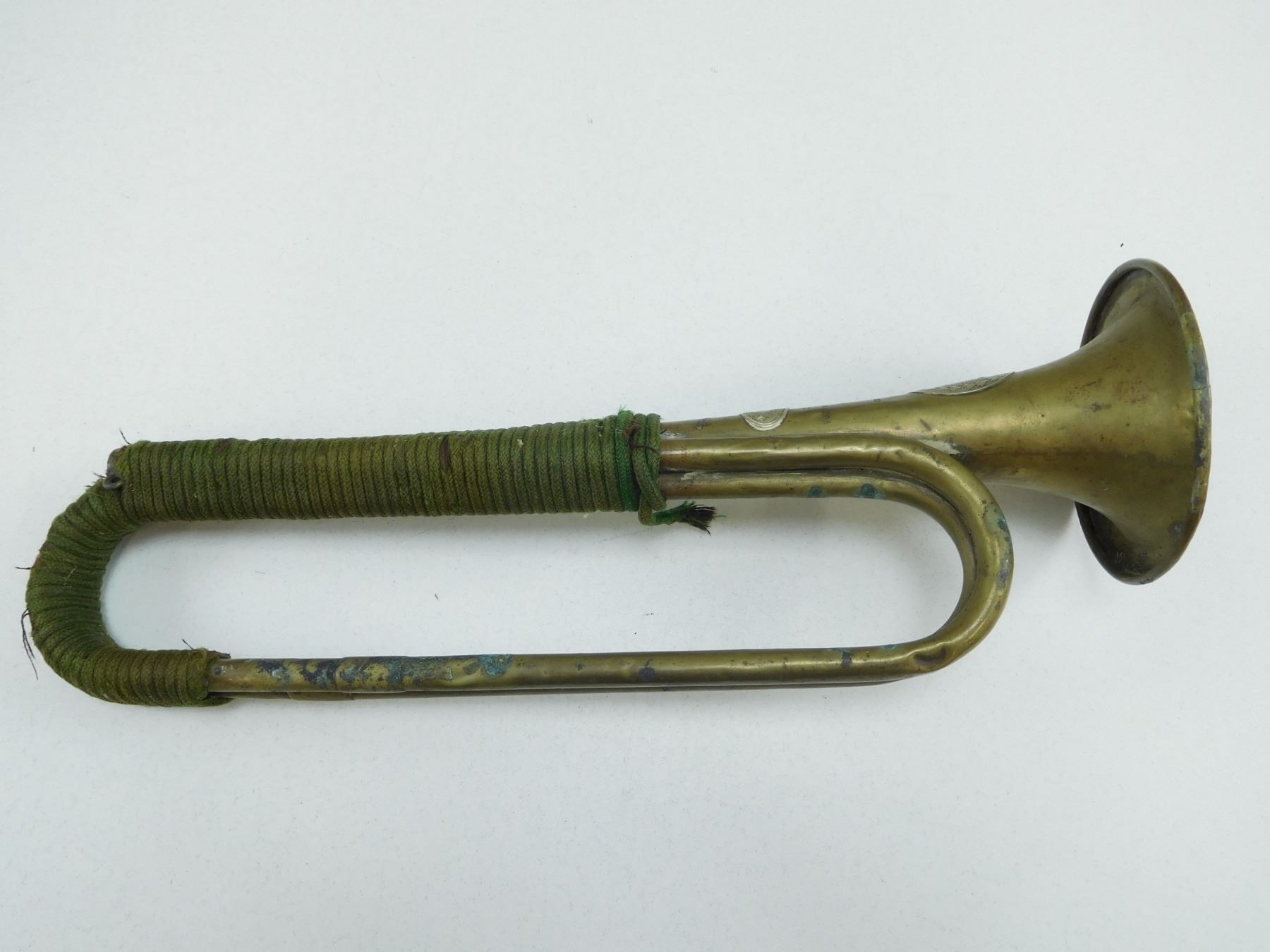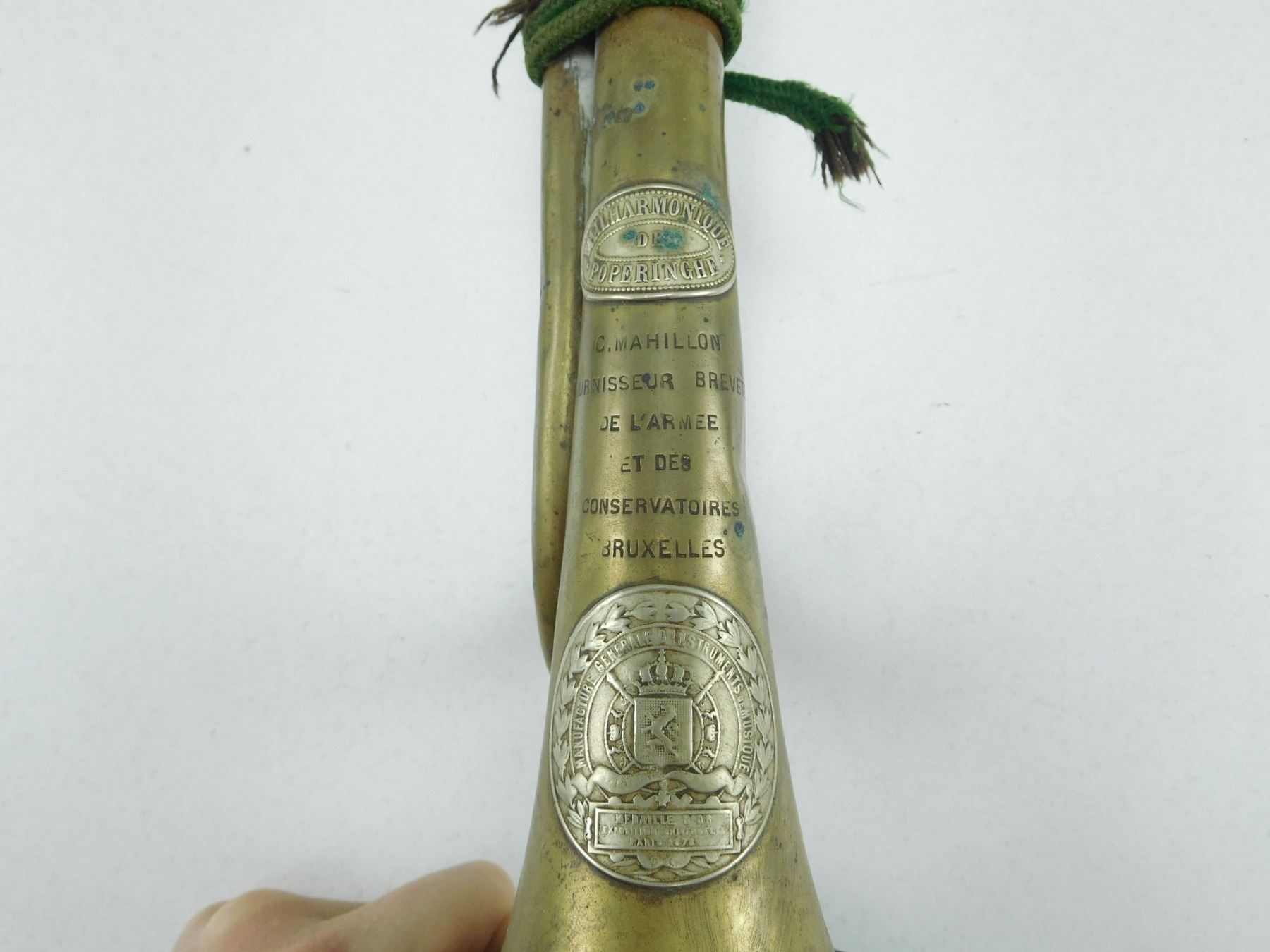 BUGLE , STAMPED PHILHARMONIQUE DE POPERINGHE C.MAHILLON POURNISSEUR BREVETE DE L'ARMEE ET DES CONSERVATOIRES BRUXELLES MANUFACTURE GENERALE D'INSTRUMENTS DE MUSIQUE, MOUTH PIECE IS MISSING, GREEN BRAID IS FRAYED AND MISSING ENDS