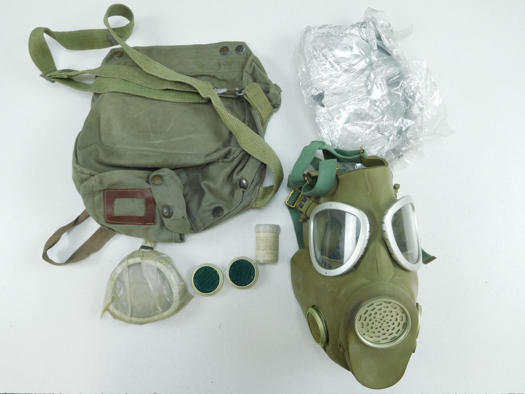 MILITARY SURPLUS GAS MASK KIT , WITH EXTRA EYE LENS, FILTERS, CAPS, FULAR, AND BAG