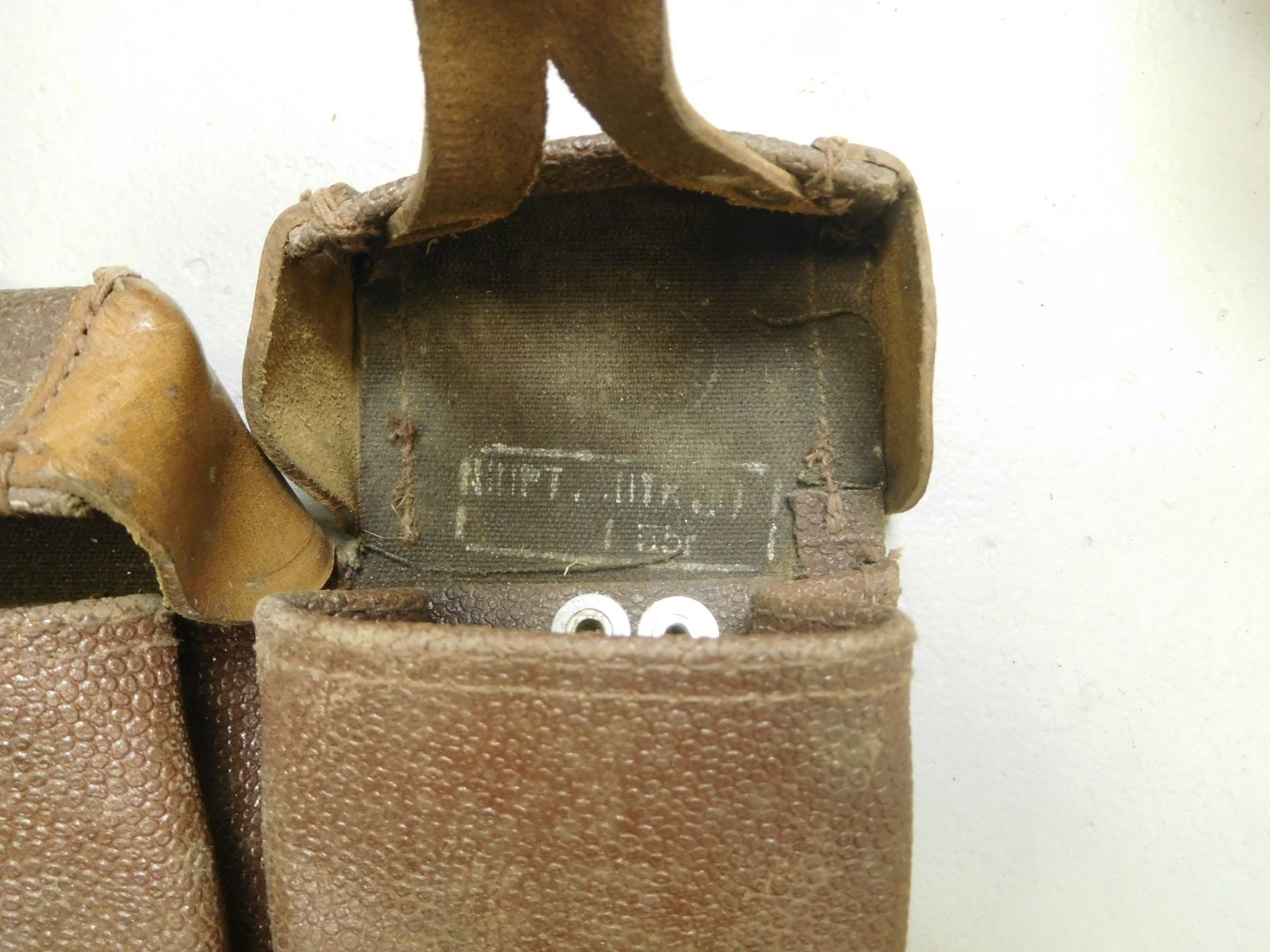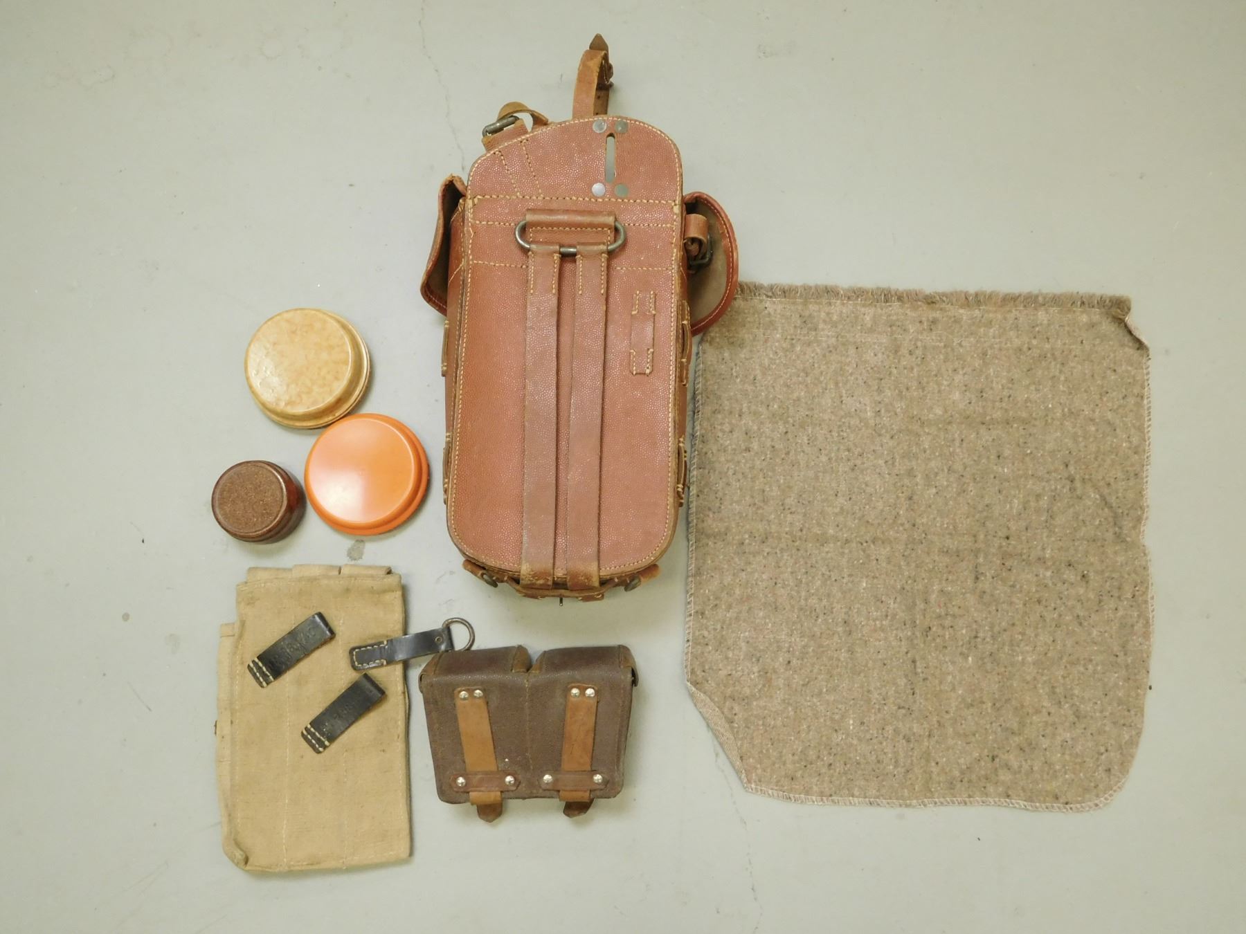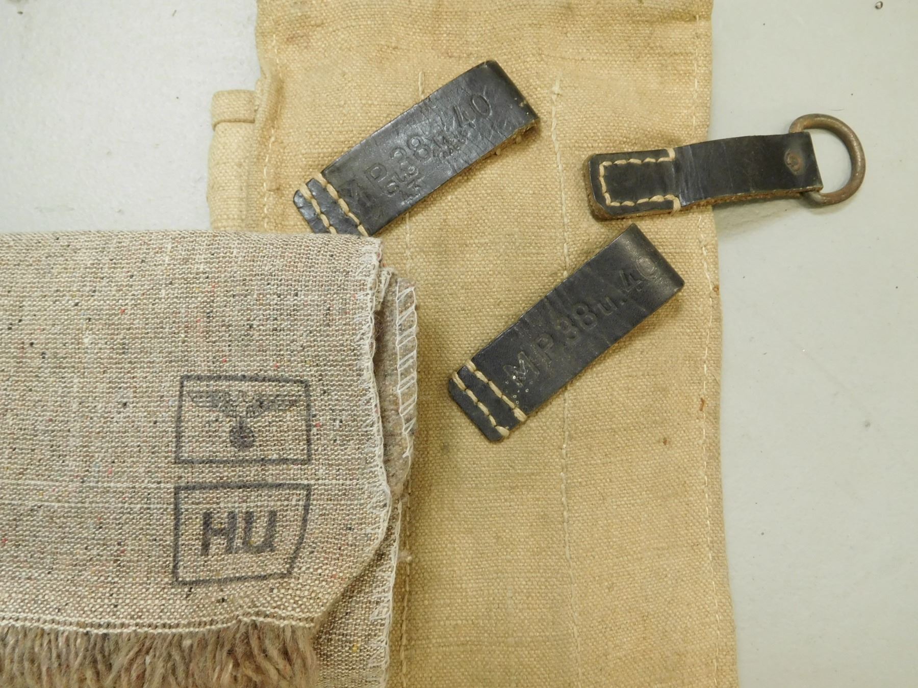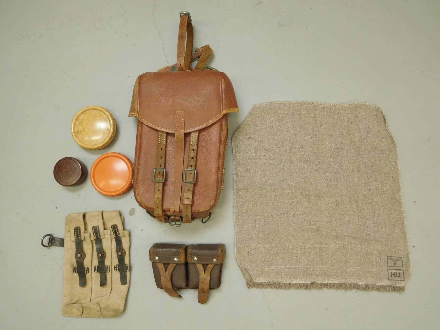 ASSORTED LOT , INCLUDES SKS POUCH, LARGE LEATHER BAG, GERMAN WWII FABRIC MARKED H.U, GERMAN MAGAZINE POUCH STAMPED MP38U 40 WITH WAFFIN MARK WAA866, & (3) BAKELITE CONTAINERS