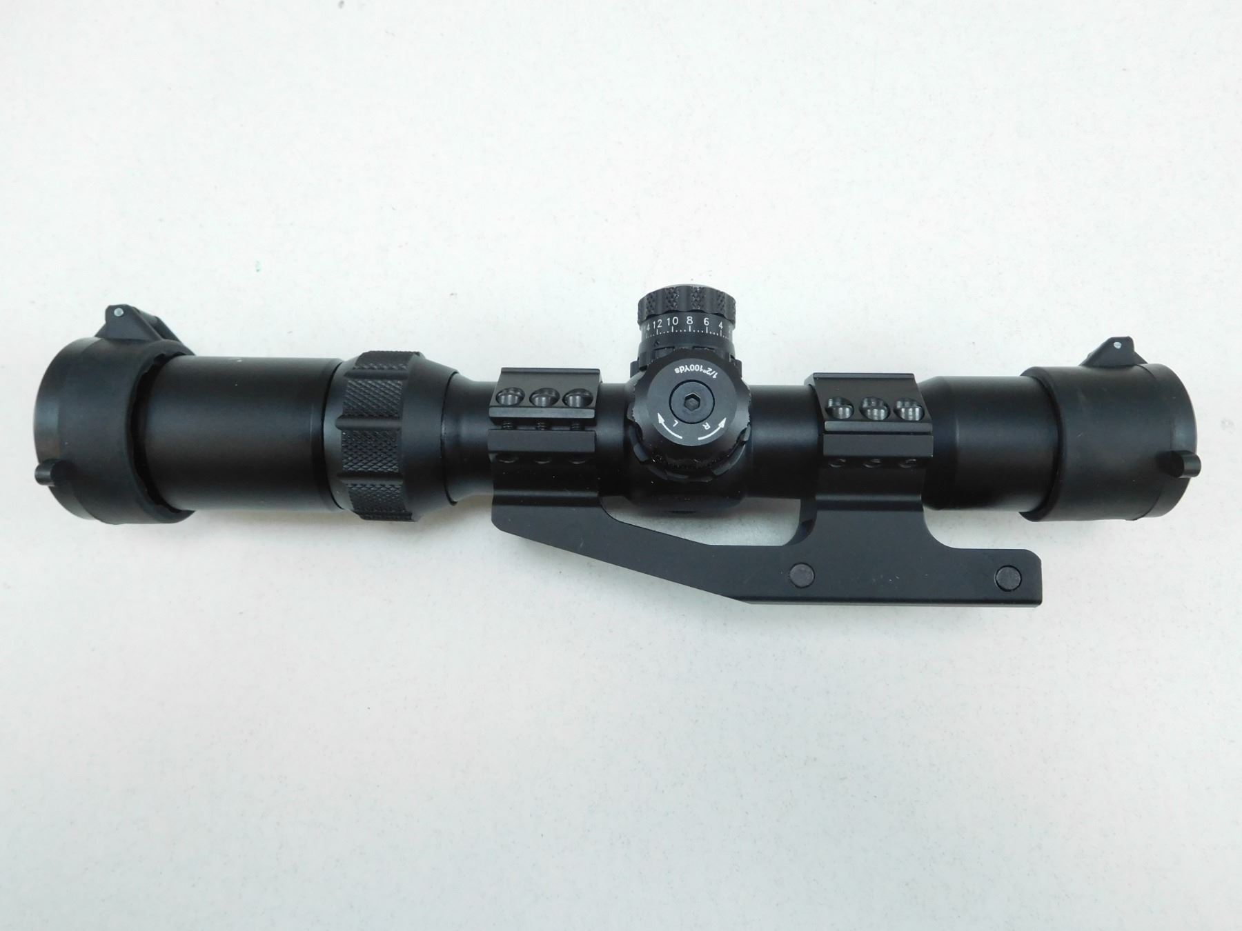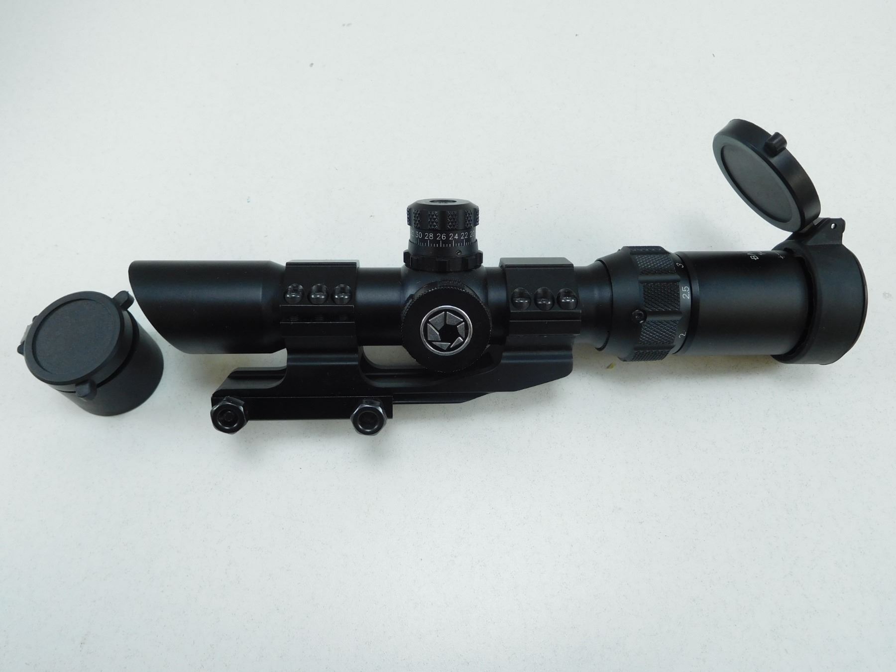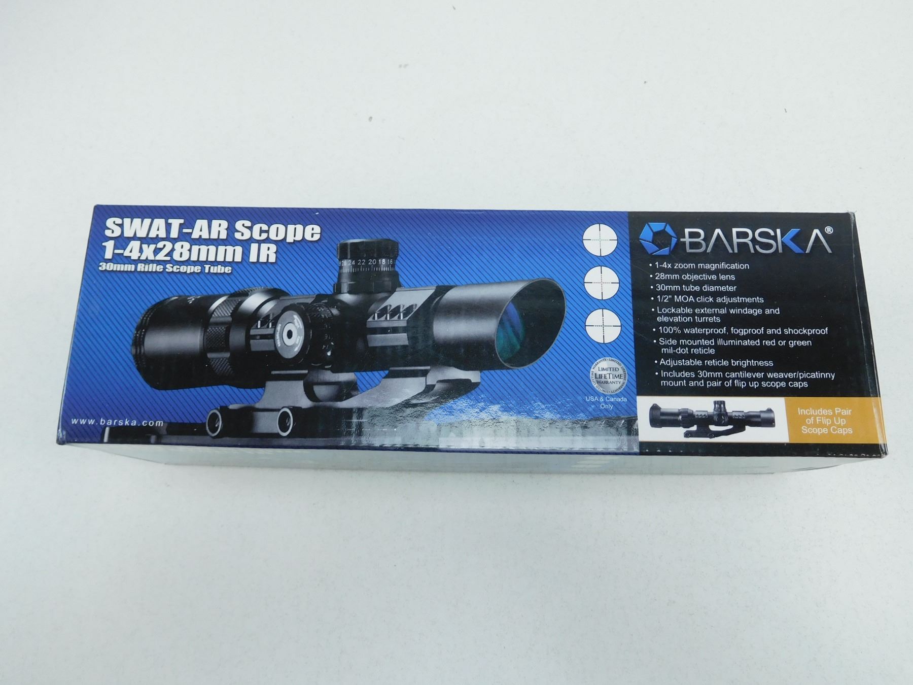 BARSKA 1-4X28 RED/GREEN DOT SCOPE , CLEAR VISIBILITY, WITH POP OPEN LENS CAPS & SCOPE MOUNT, WITH INSTRUCTIONS & BOX