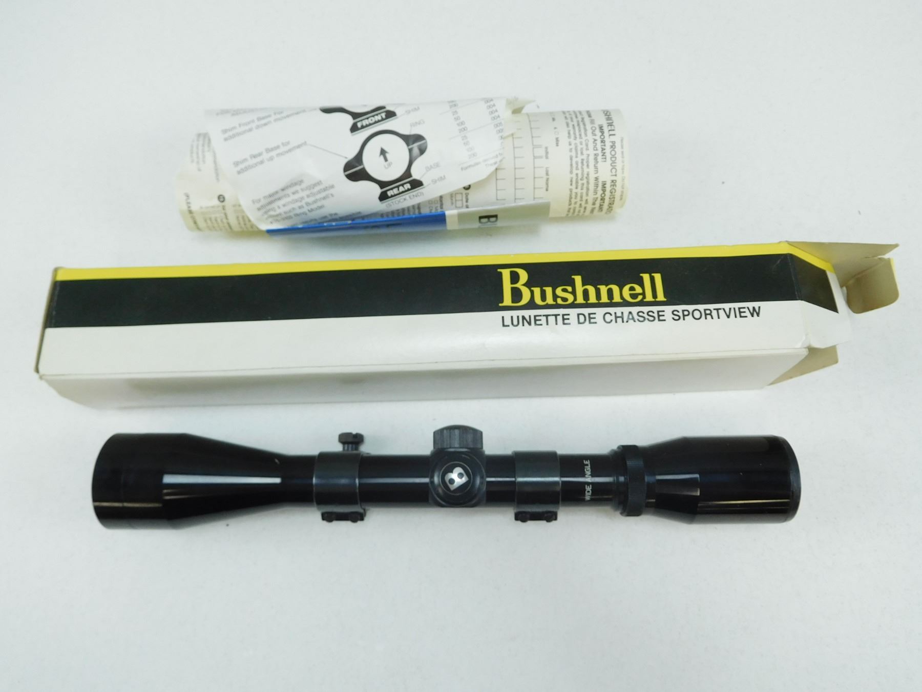 BUSHNELL 4X-38 SCOPE , CLEAR VISIBILITY, WITH WEAVER SCOPE RINGS, INSTRUCTIONS & BOX