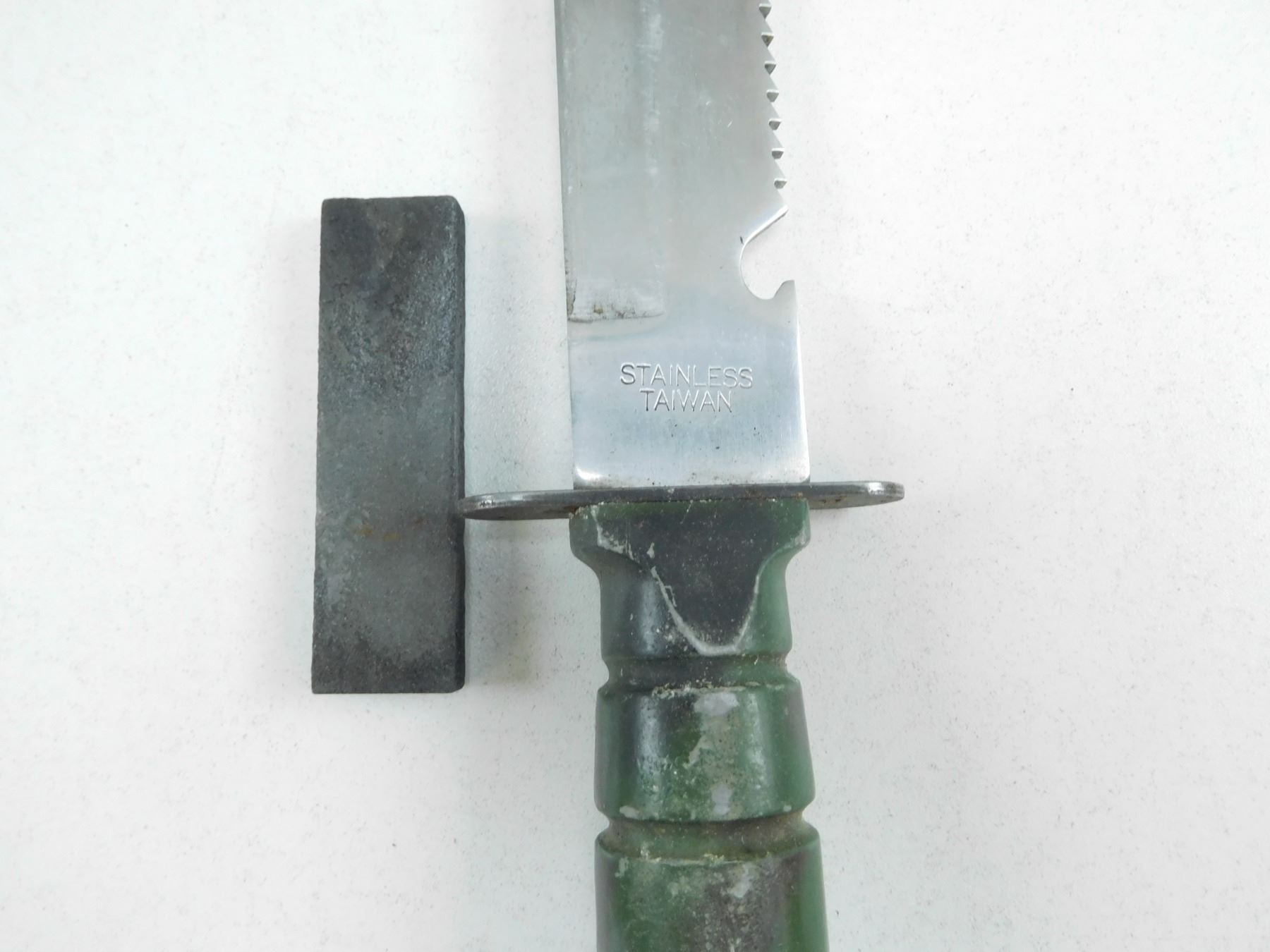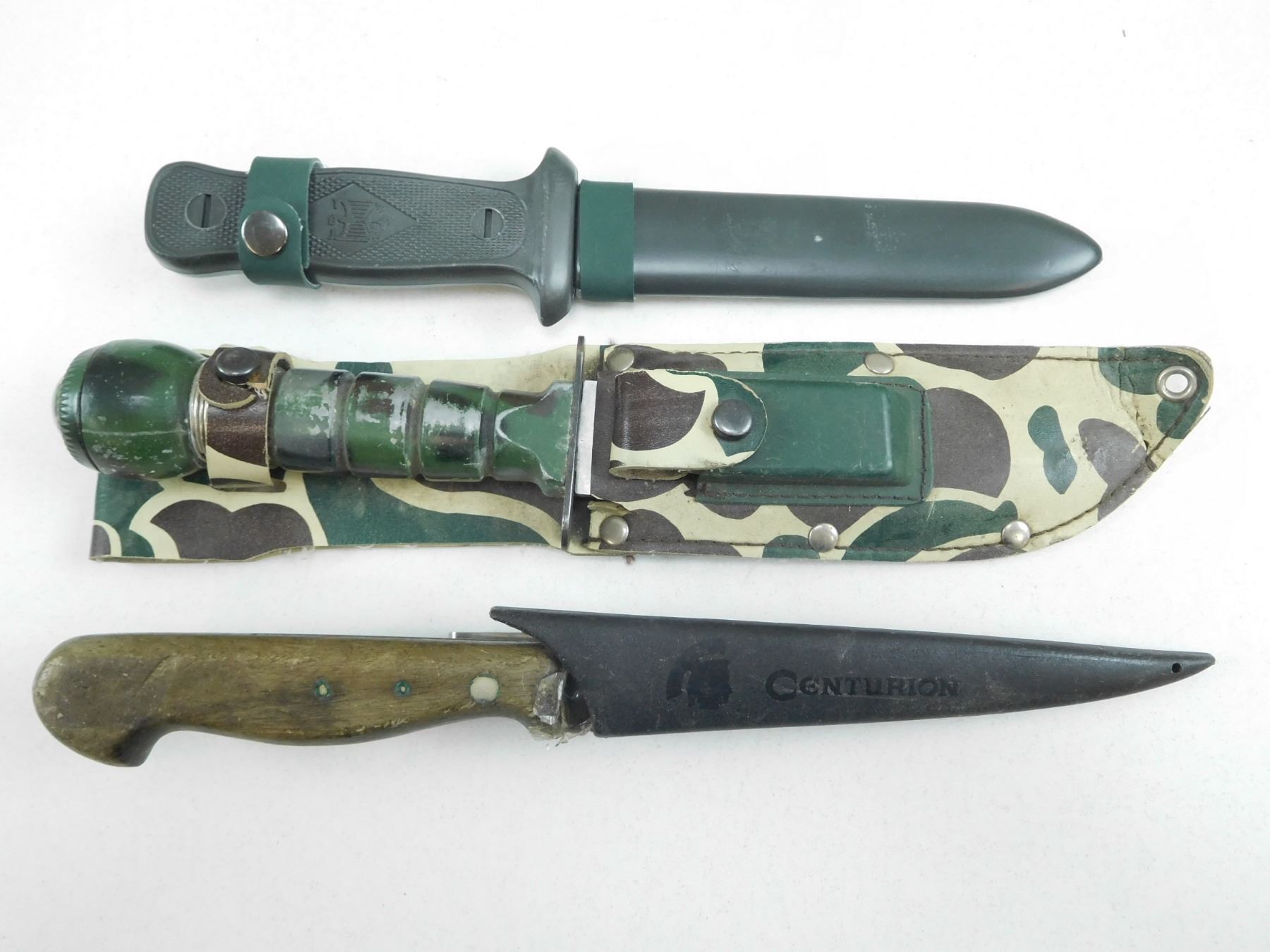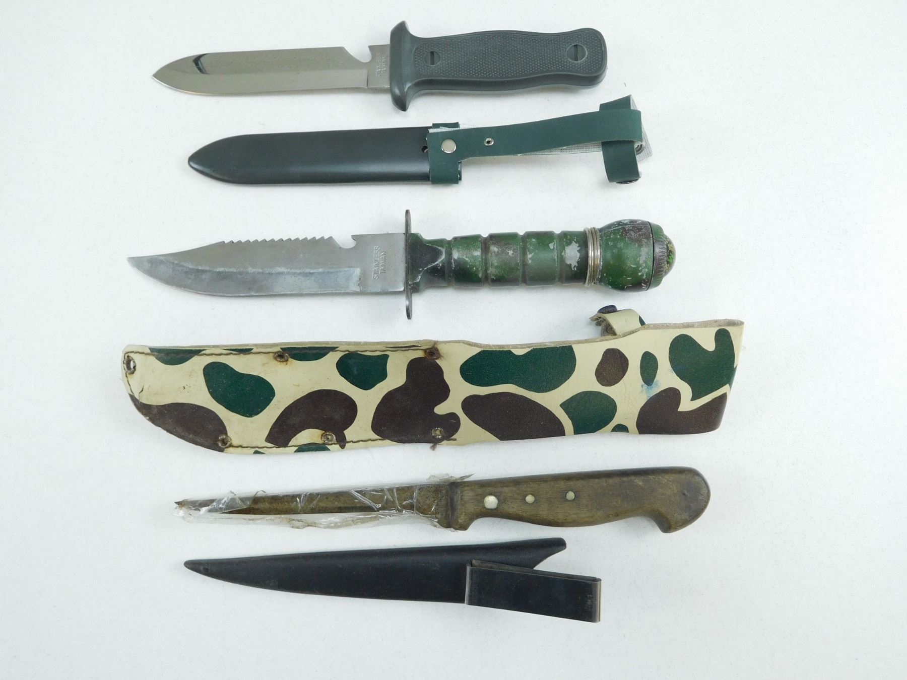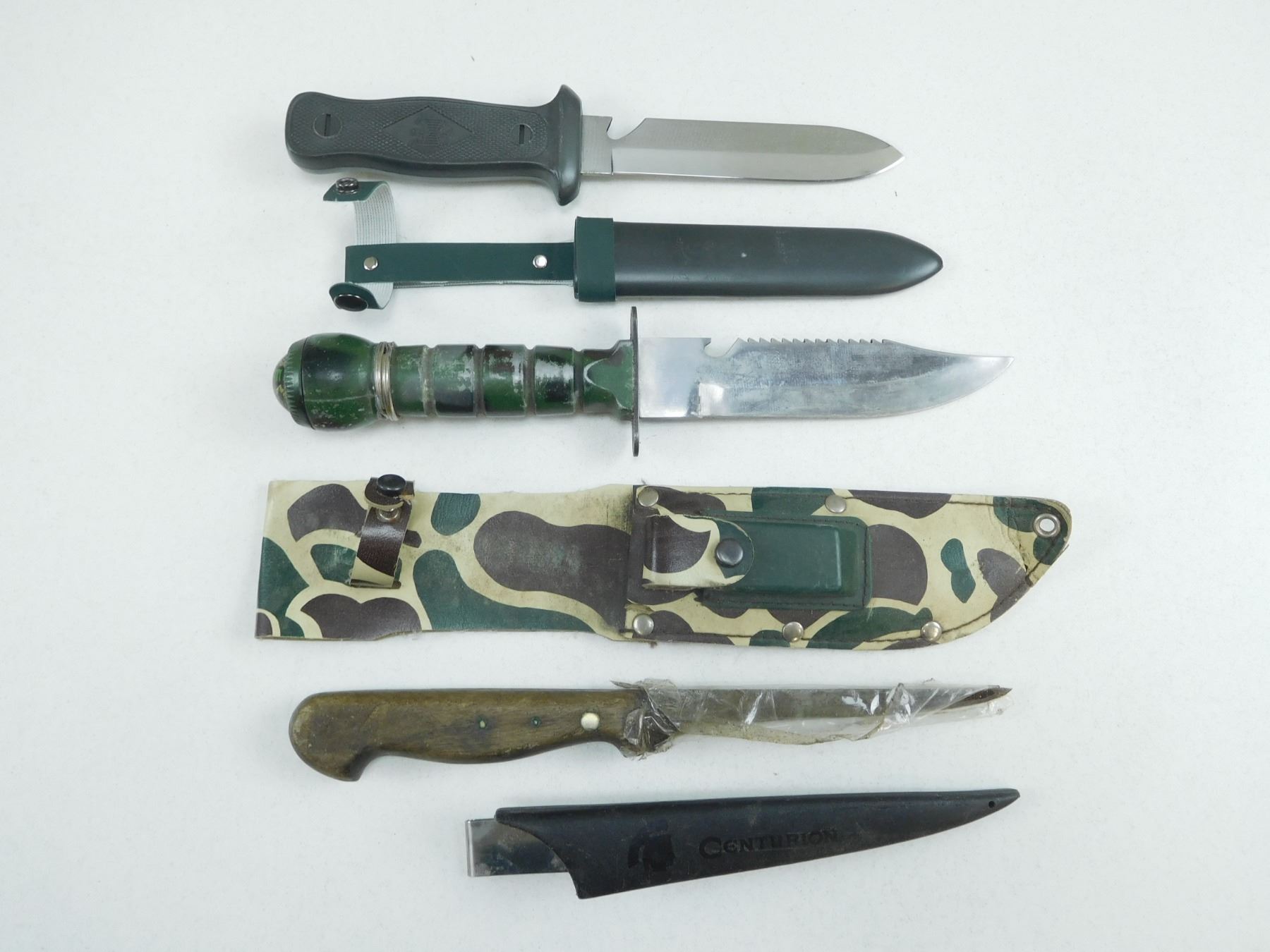 ASSORTED KNIVES , (1) SURVIVAL KNIFE WITH SHARPENING STONE & SHEATH, (1) FILET KNIFE WITH SHEATH, (1) KNIFE WITH SHEATH GERMAN STYLE EAGLE ON HANDLE, LOT OF 3