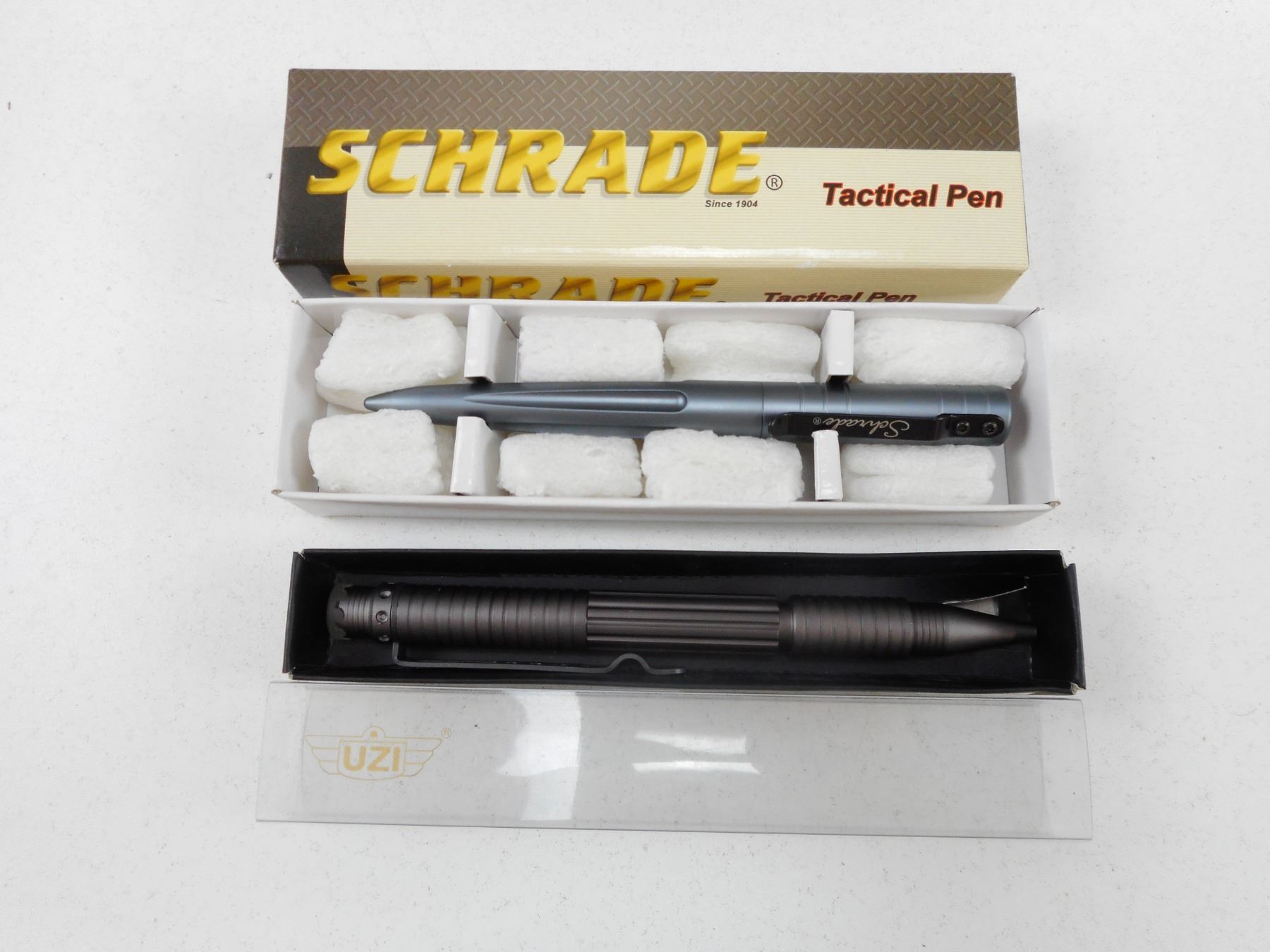TACTICAL PENS , (1) SCHRADE TACTICAL PEN- SCPENG PEN GREY WITH BOX, (1) UZI TACTICAL PEN- TACPEN1-6M, LOT OF 2