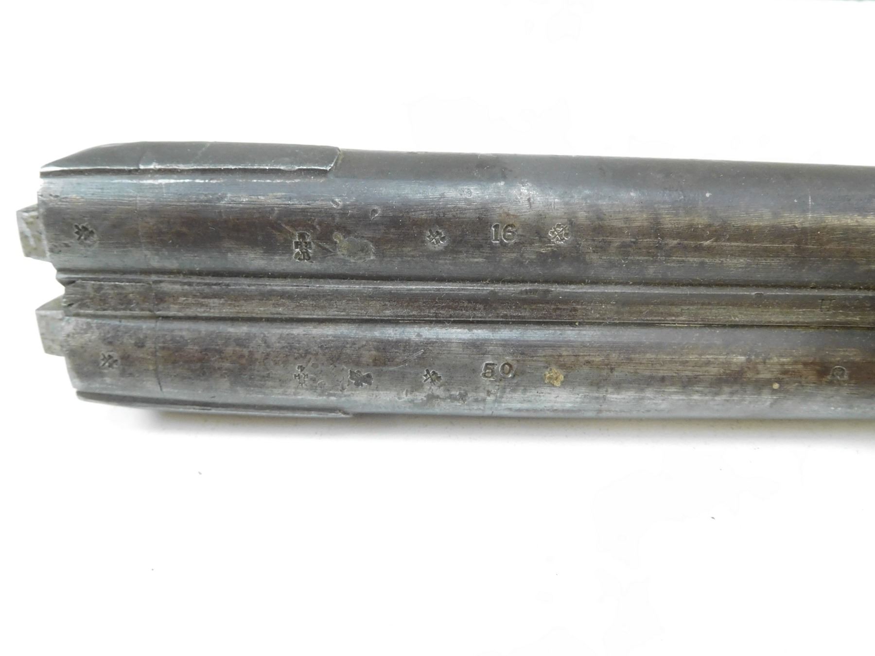 SIDEXSIDE PERCUSSION BARREL , BARREL LENGTH: 30" BLADE FRONT SIGHT, DIFFERENT CALIBERS CAPACITY, BRITISH PROOF MARKS & J.H., BROKEN PIECE