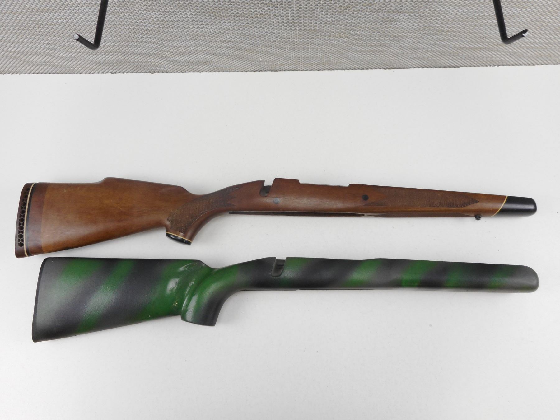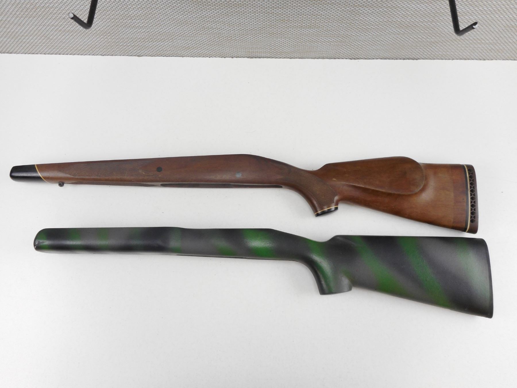 WINCHESTER M70 GUN STOCKS , WOODEN: (1) PAINTED CAMO HY. BARREL SHORT ACTION, WITH WINCHESTER RUBBER BUTT PLATE (1) SHORT ACTION HAS BEEN REPAIRED WITH WHITE LINE RECOIL PAD, LOT OF 2