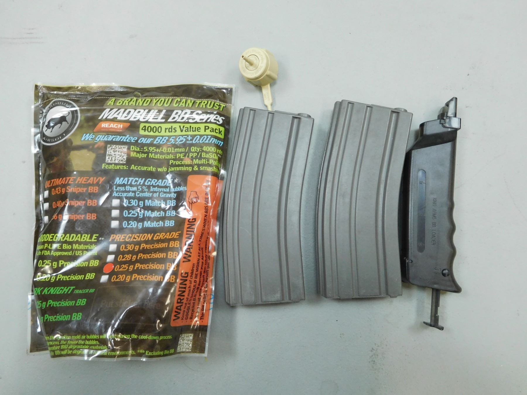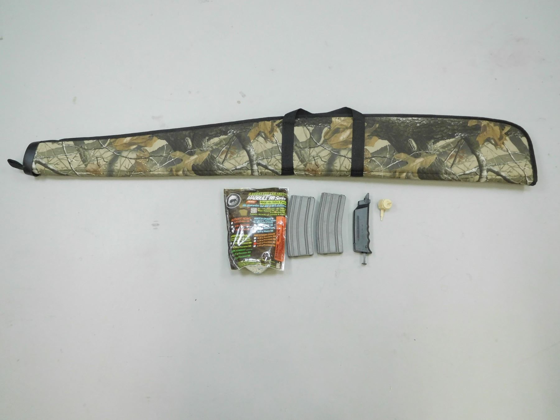 BB ACCESSORIES & SOFT CASE , (1) 4000 RNDS OF MADBULL BB SERIES PRECISION GRADE .25G PRECISION BB UNOPENED BAG, BB MAGAZINES AND KING ARMS BB LOADER, (1)KOLPIN CAMO SOFT CASE