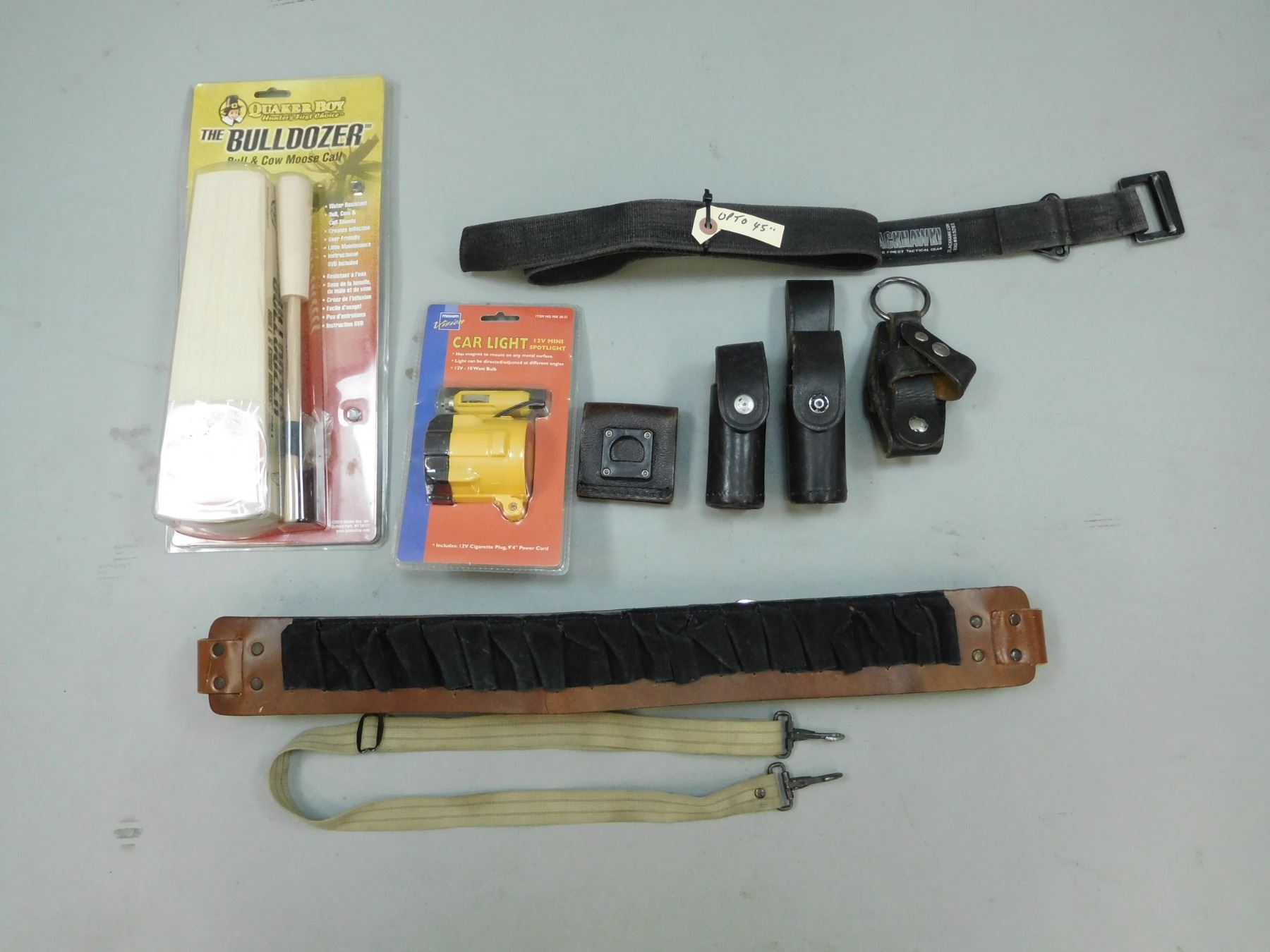 ASSORTED LOT , INCLUDES HOLSTER, SLINGS, FLASHLIGHT, BULLDOZER MOOSE CALL-NEW IN PACKAGING