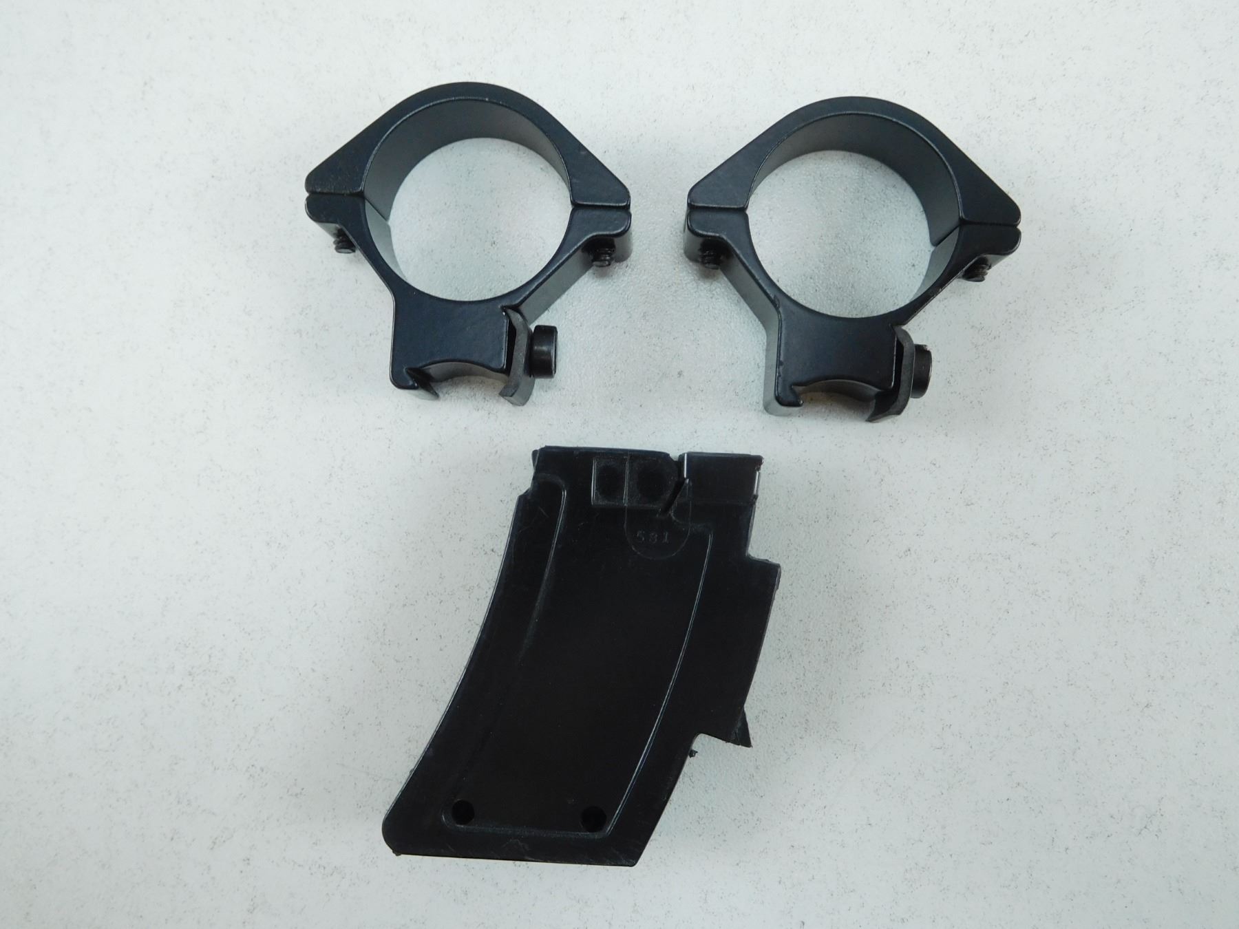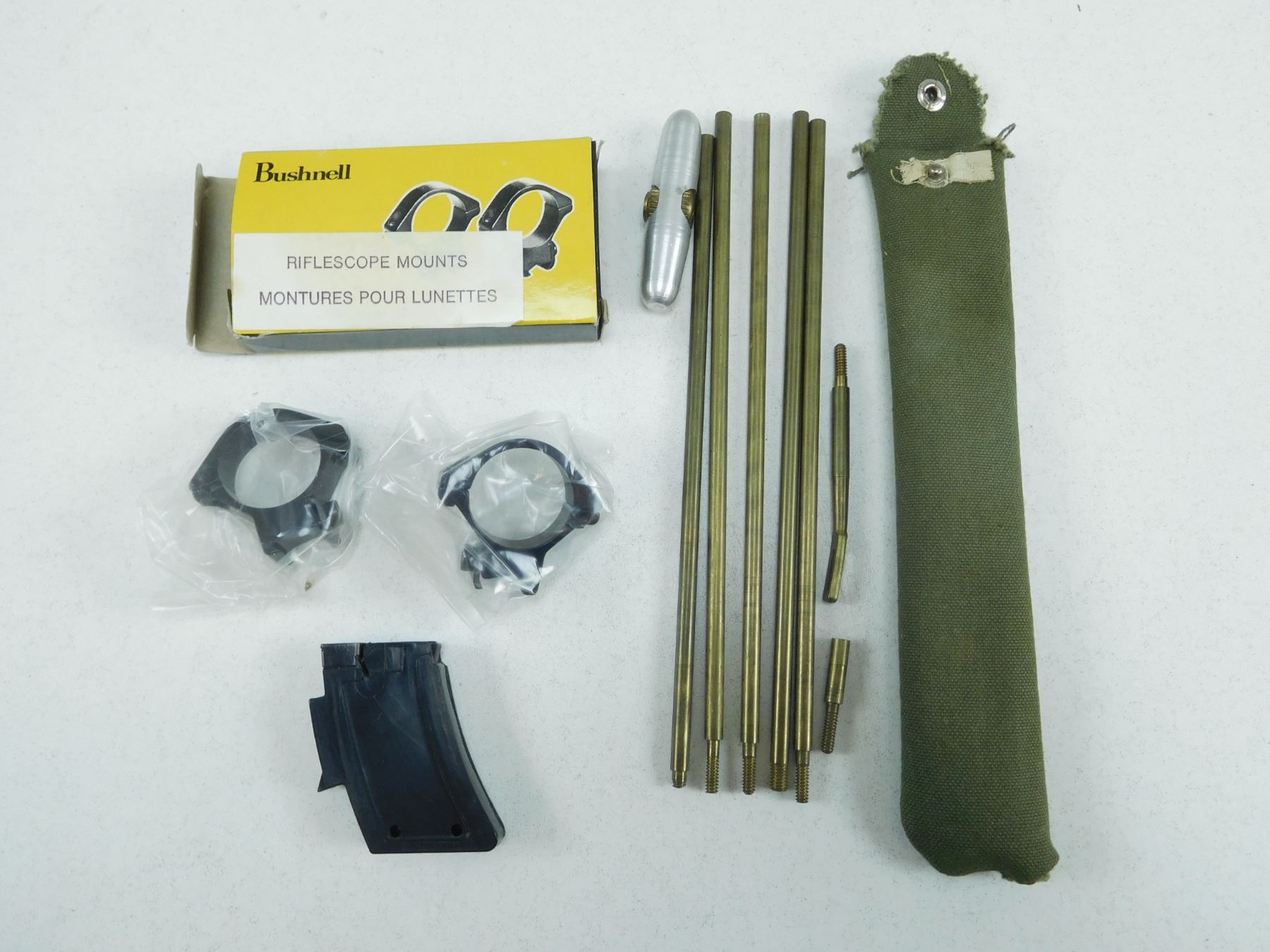 ASSORTED LOT , INCLUDES 22 LR MAGAZINE, (1) CLEANING ROD KIT, (1) BUSHNELL RIFLESCOPE MOUNTS IN BOX