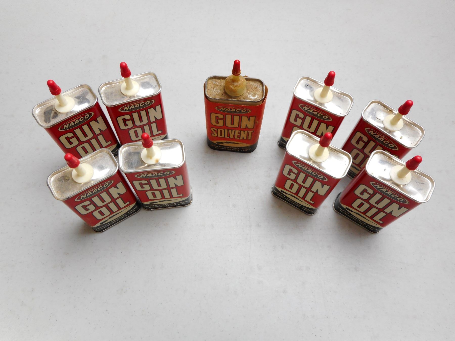 GUN OIL , INCLUDES ANTIQUE CANS WITH SOME OIL, LOT OF 9
