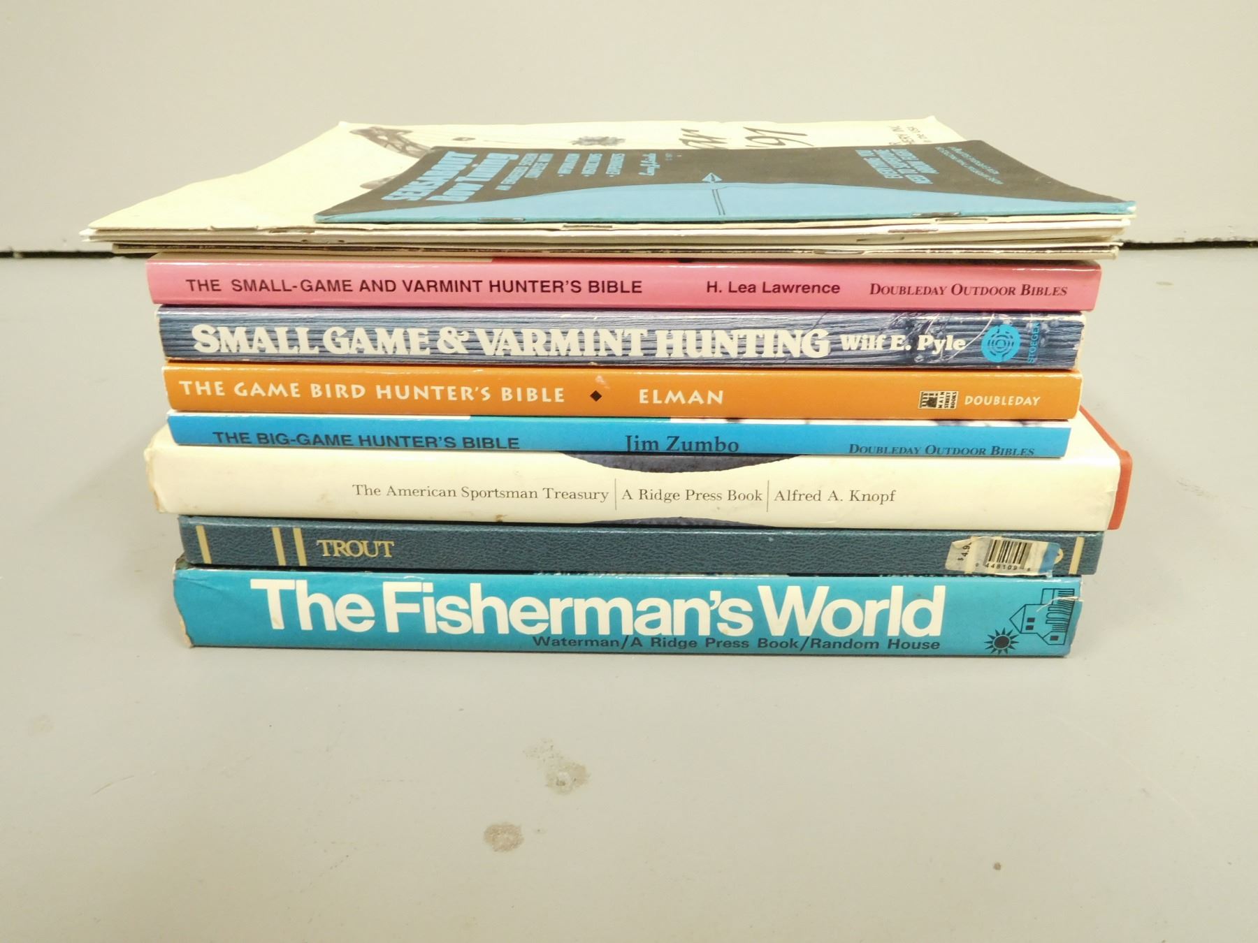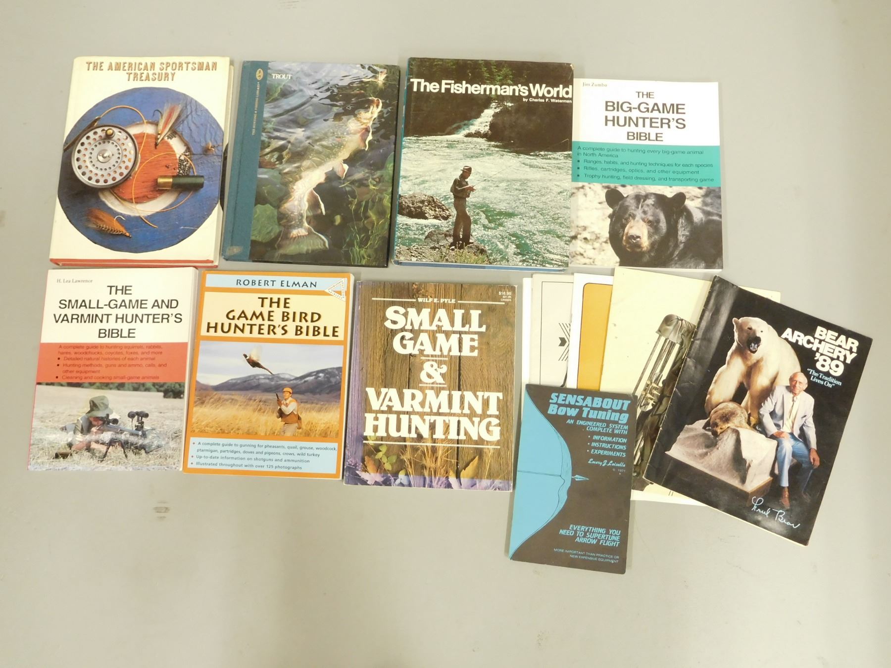 ASSORTED HUNTING/FISHING BOOKS , (1) THE AMERICAN SPORTSMAN TREASURY, (1) TROUT, (1) THE FISHERMAN'S WORLD, (1) THE BIG-GAME HUNTER'S BIBLE, (1)THE SMALL-GAME AND VARMINT HUNTER' BIBLE, (1) THE GAME BIRD HUNTER'S BIBLE, (1) SMALL GAME & VARMINT HUNTING, (4) CATALOGS FOR ARCHERY, LOT OF 11