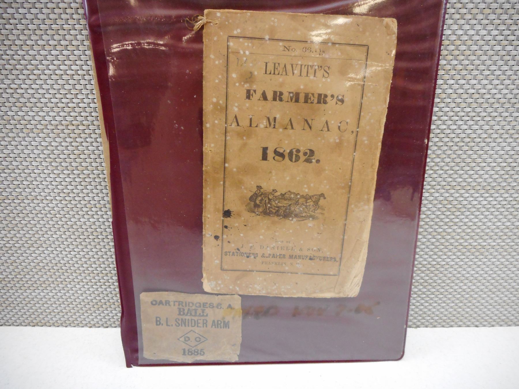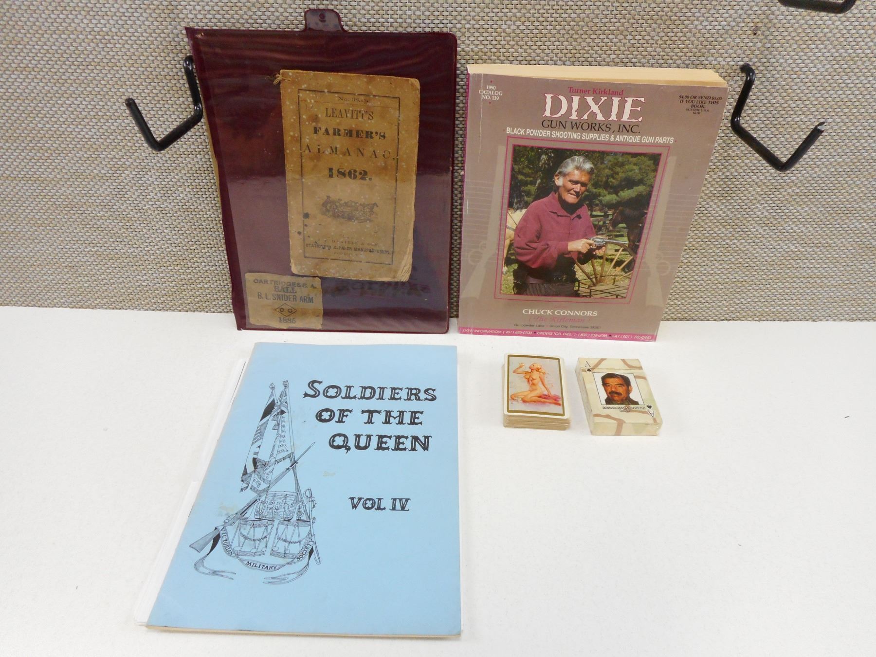 ASSORTED LOT , INCLUDES (1) SOLDIERS OF THE QUEEN VOLUME IV, (1) DIXIE GUN WORKS INC. (1) LEAVITTS FARMER'S ALMANAC 1862, (1) DECK OF SADDAM HUSAYN PLAYING CARDS, (1) LADY PLAYING CARDS & ASSORTED PHOTO COPIES OF GUN INFORMATION