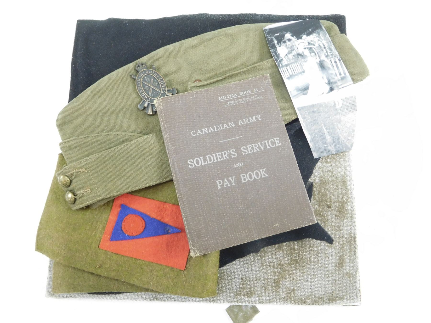 (FROM SPICER COLLECTION), SIDE HAT WITH CANADIAN INFANTRY CORPS CAP BADGE, PHOTO, AND ARM BAND WITH FABRIC BADGE, SIZE 11 X 11 X 2.5", FIREARM BELONGING TO THIS MAN IS AVAILABLE IN SESSION 3 LOT # 903