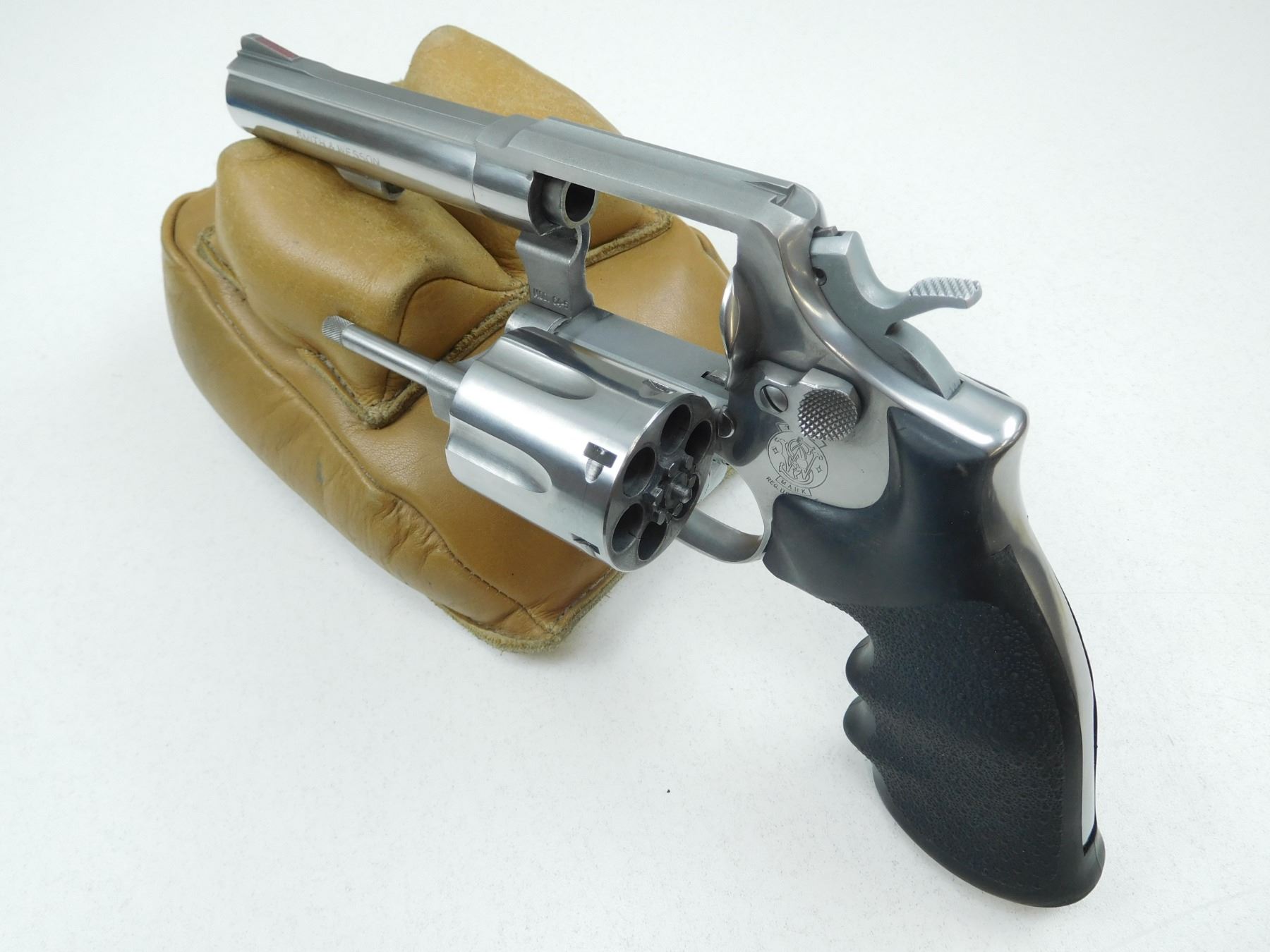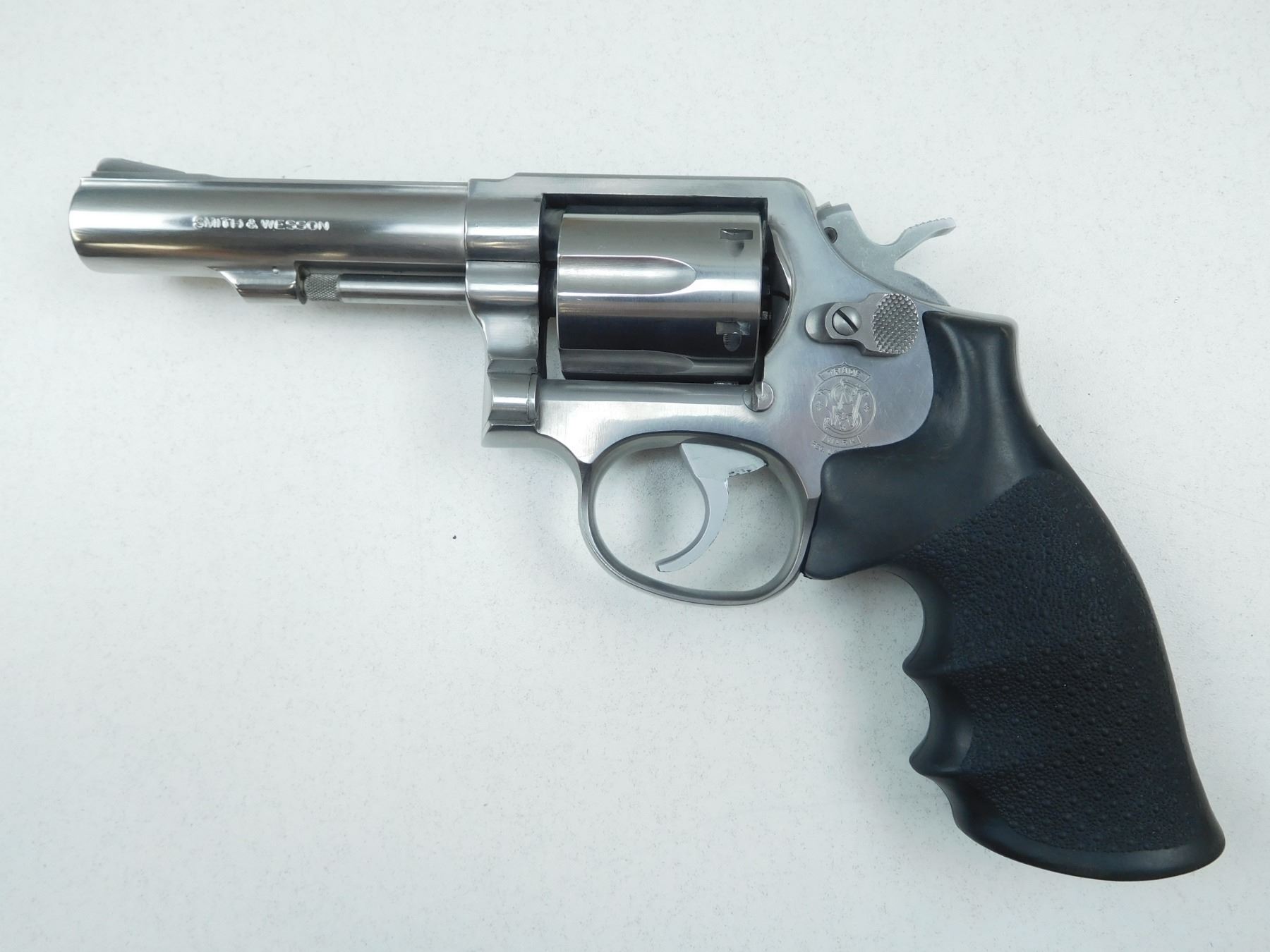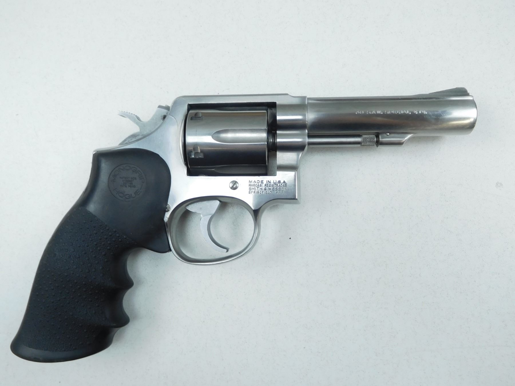 SMITH &WESSON , MODEL: 64-5 , CALIBER: 38 SPL , HOGUE MONOGRIP, BLADE AND FIXED NOTCH SIGHT, STAINLESS STEEL FINNISH, EXCELLENT BORE, DOUBLE ACTION , BARREL LENGTH: 102MM , SERIAL # BFL1910 , STOCK # 2151 , CONDITION: 9/10 , CLASS: CANADIAN PROHIBITED CLASS