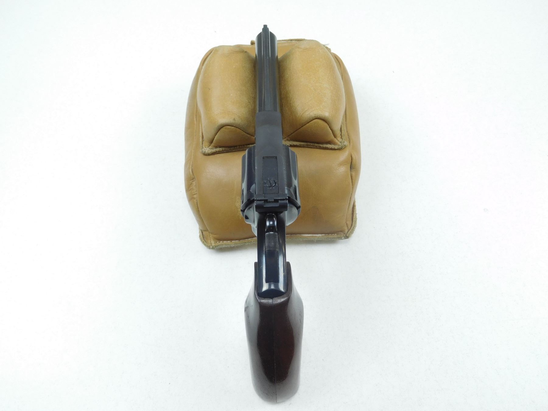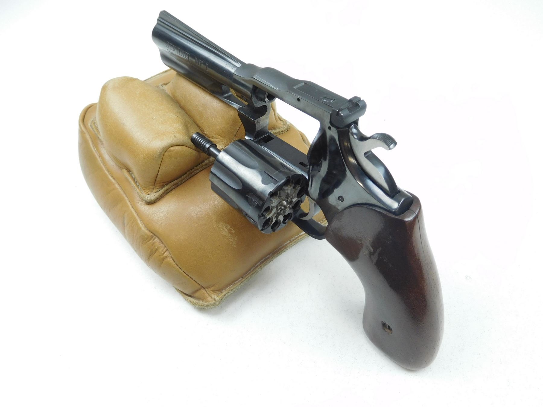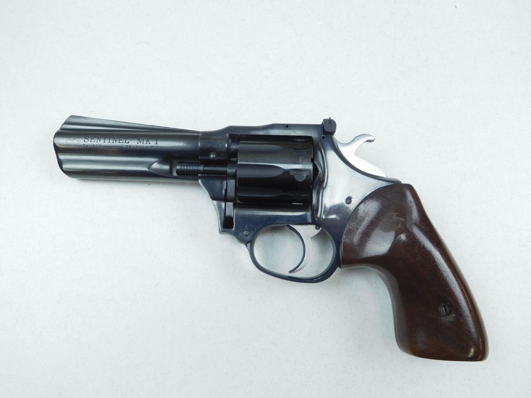 HIGH STANDARD , MODEL: SENTINAL MARK 1 , CALIBER: 22 LR , CUSTOM CONTOURED SMOOTH WOOD GRIPS, FIXED BLADE AND ADJUSTABLE REAR TARGET SIGHTS, 90% BLUE MINOR HANDLING MARKS, DOUBLE ACTION , BARREL LENGTH: 101MM , SERIAL # S55796 , STOCK # 2158 , CONDITION: 9/10 , CLASS: CANADIAN PROHIBITED CLASS