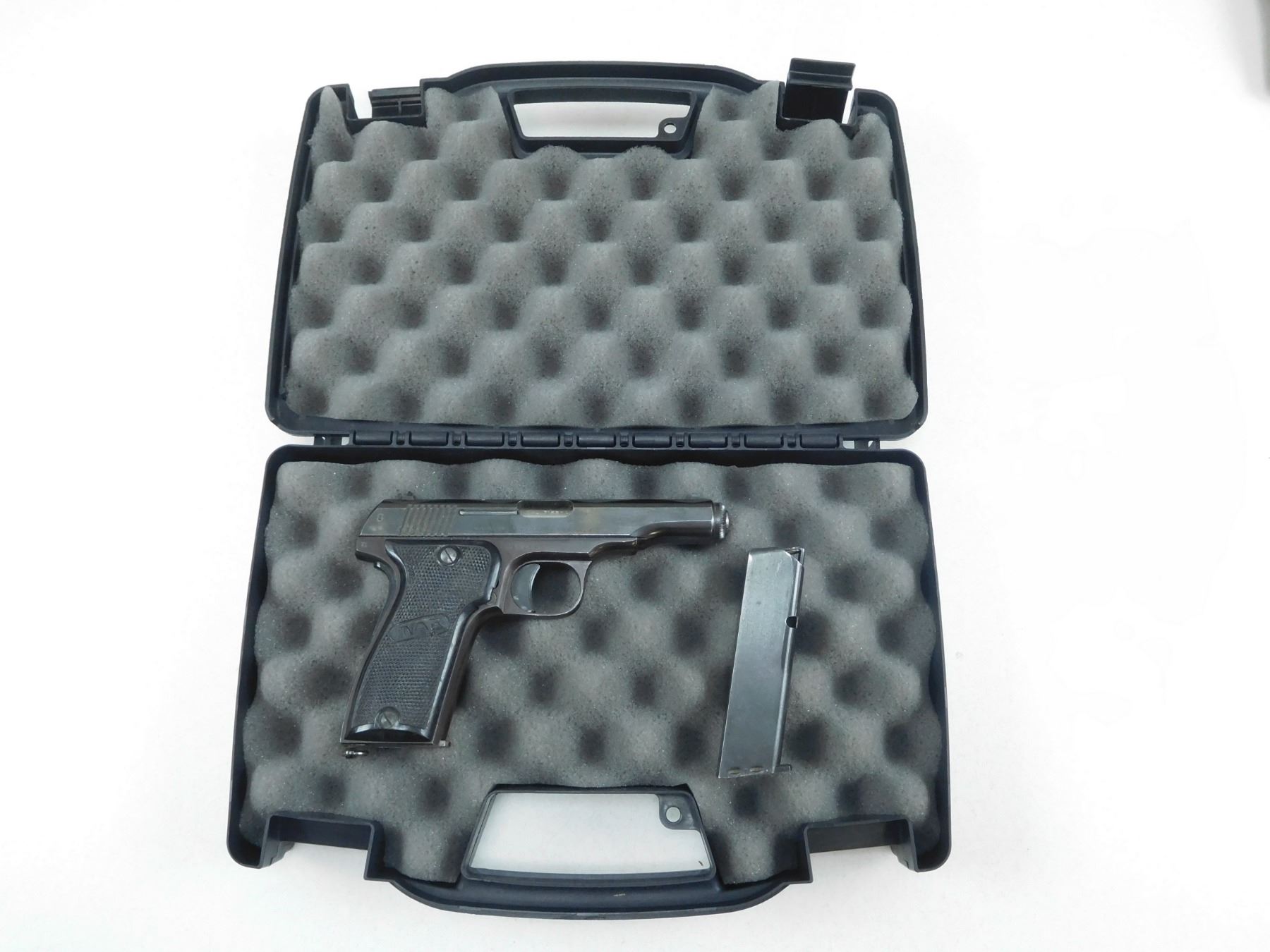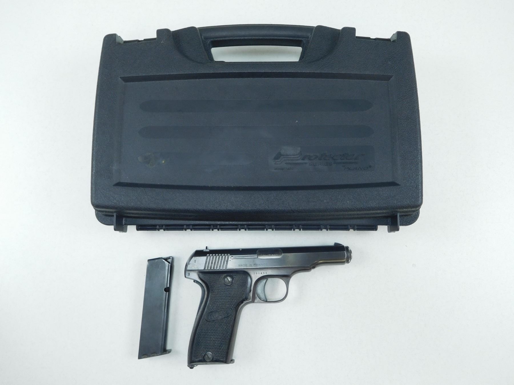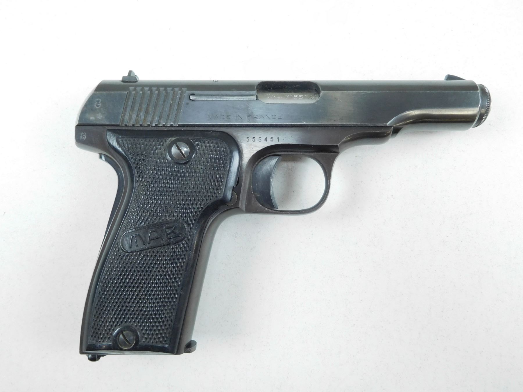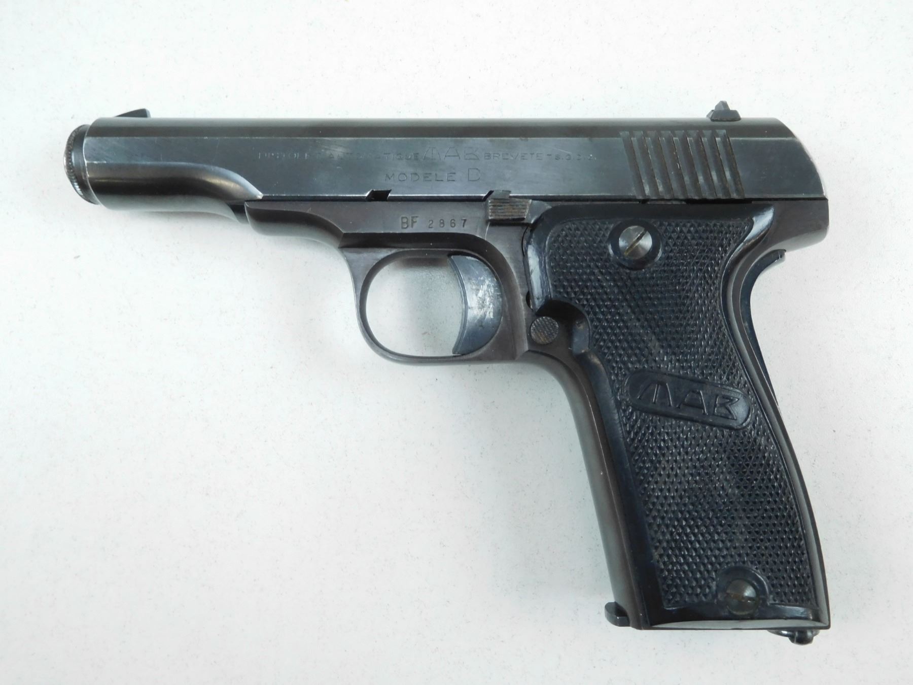 MAB , MODEL: D , CALIBER: 7.65MM , COMES WITH CASE AND 2ND MAGAZINE "BF"2887 ON RIGHT FRAME DENOTES THAT THIS FIREARM WAS ISSUED TO THE BANK OF FRANCE, FIXED NOTCH AND BLADE SIGHTS, GRIP SAFETY, CHECKERED PLASTIC GRIPS, GOOD BORE, BLUE EXIBITS SLIGHT HOLSTER WEAR, , BARREL LENGTH: 102MM , SERIAL # 355451 , STOCK # 2161 , CONDITION: 8/10 , CLASS: CANADIAN PROHIBITED CLASS