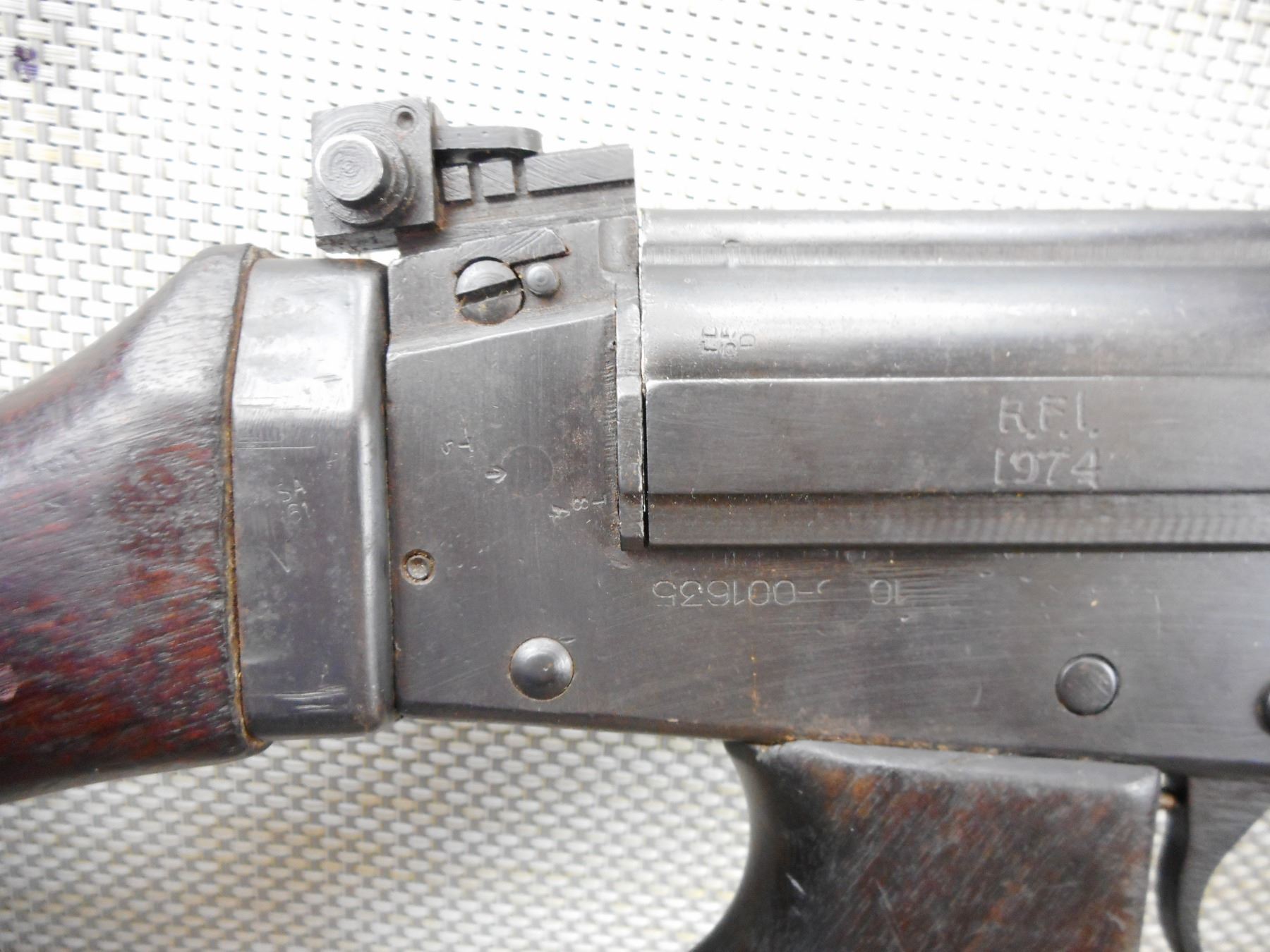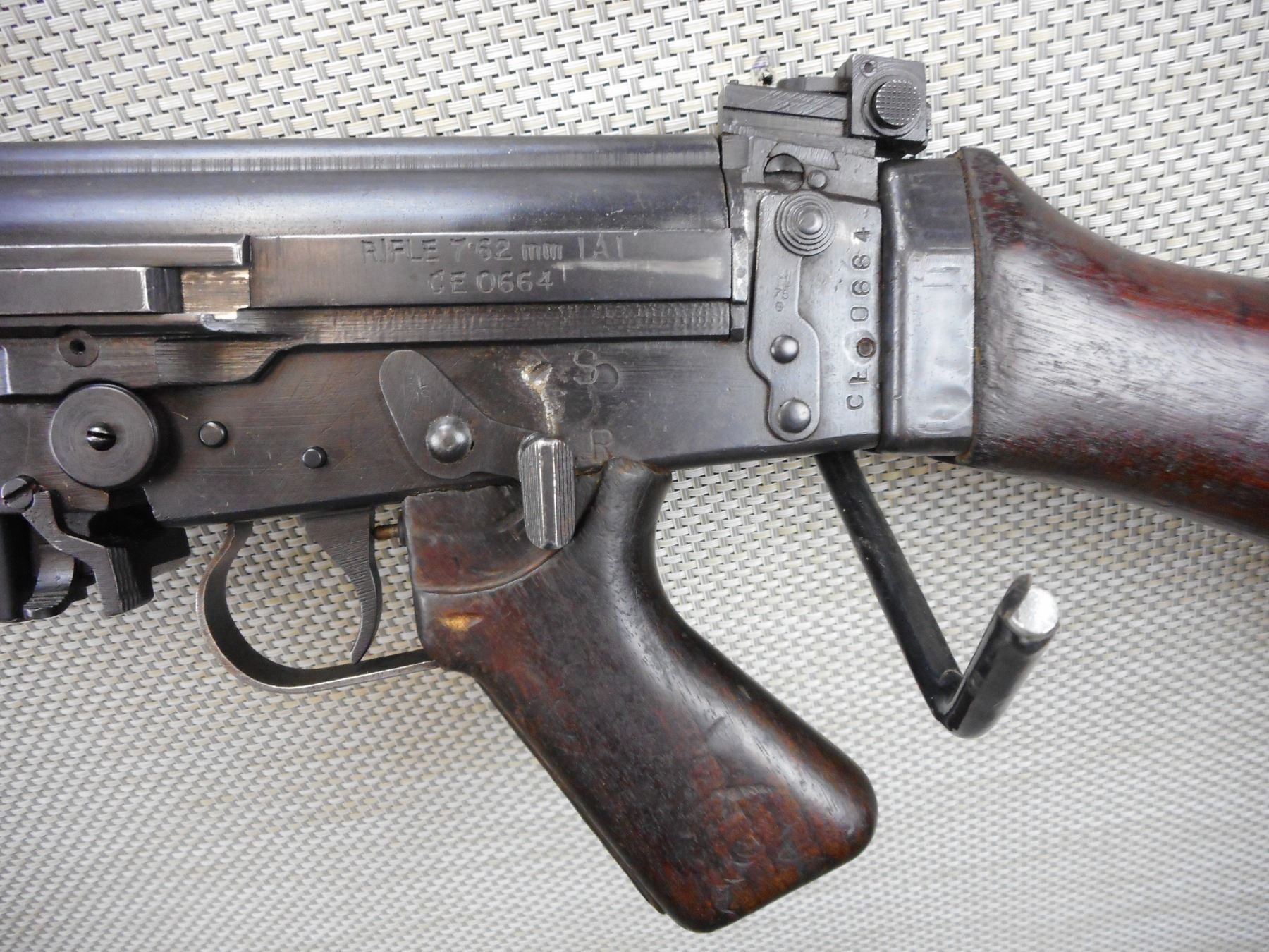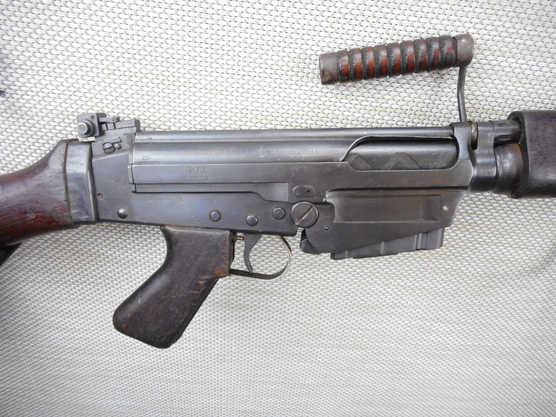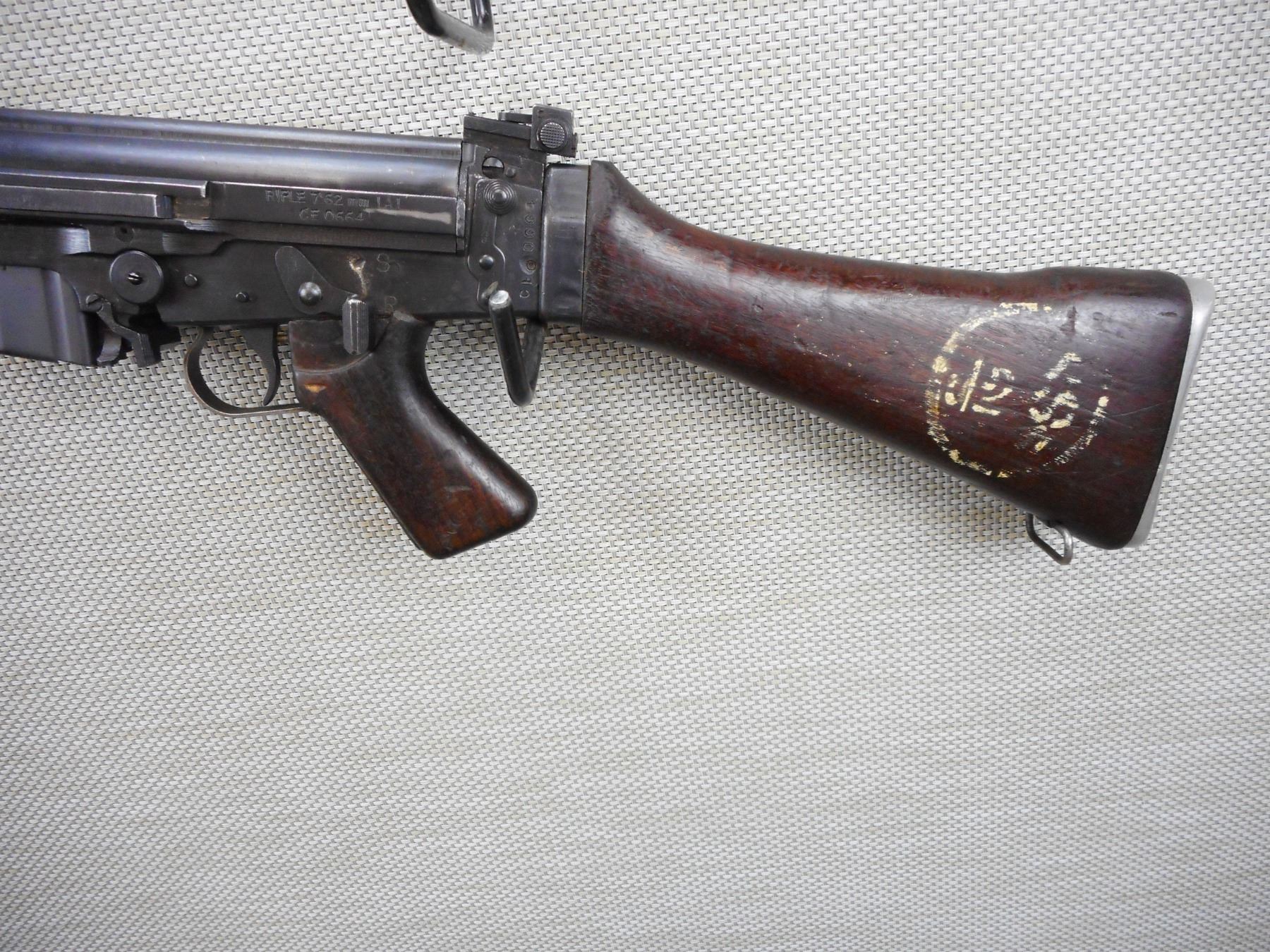FN FAL , MODEL: 1A1 , CALIBER: 7.62MM NATO , COMES WITH MAGAZINE, WOODEN STOCKS AND PISTOL GRIP, CARRY HANDLE, SLING LOOPS, ADJUSTABLE FRONT AND REAR SIGHTS, FLASH SUPRESSOR, GOOD BORE, 12-5 PROHIBITED SEMI AUTO RIFLE LICENSE REQUIRED , BARREL LENGTH: 530MM , SERIAL # CEO6644 , STOCK # 2164 , CONDITION: 8/10 , CLASS: CANADIAN PROHIBITED CLASS