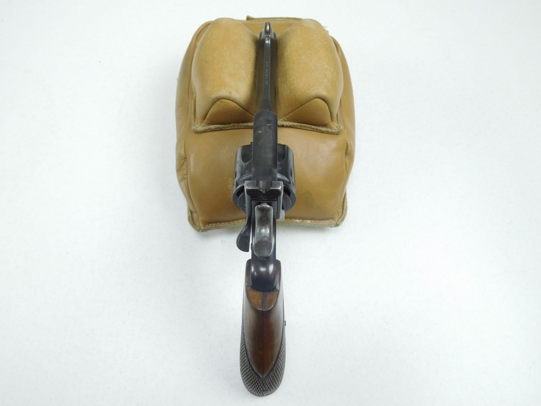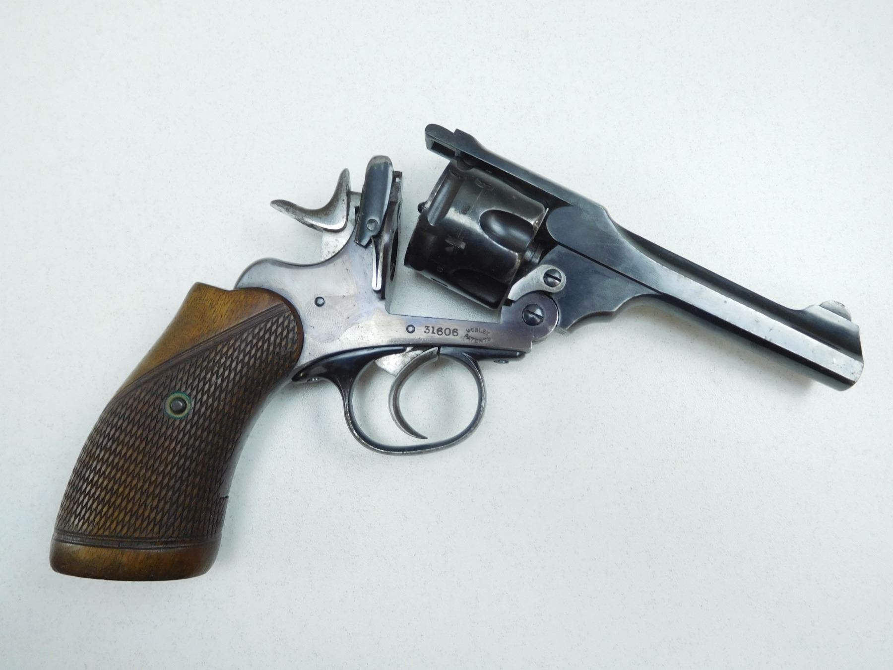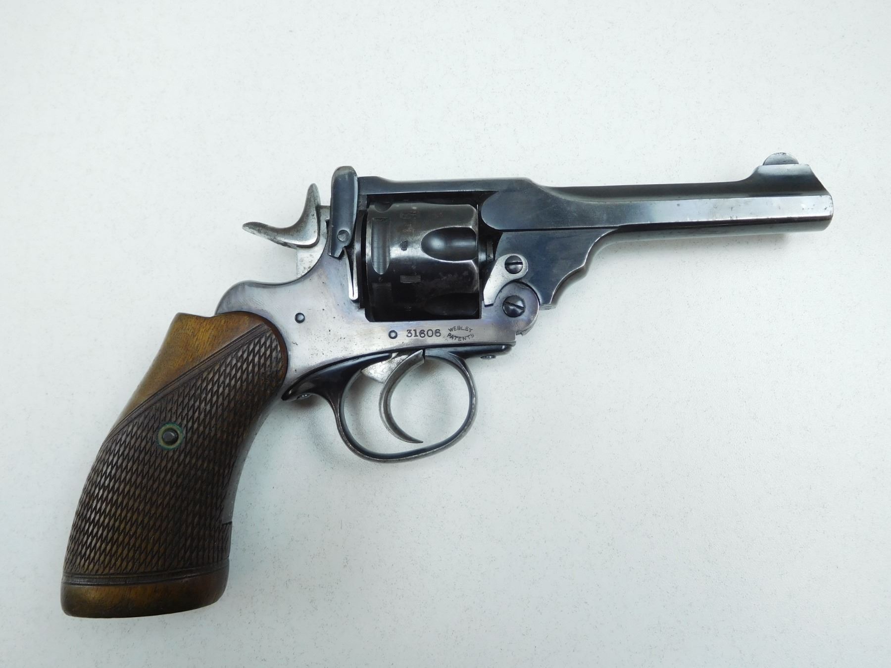 WEBLEY , MODEL: MARK III , CALIBER: 38 S&W , CARRIED IN 1952 BY DETECTIVE, FRONT STAP MARKED "OTTAWA POLICE" CHECKERED WOODEN GRIPS, FIXED NOTCH AND BLADE SIGHTS, EXCELLENT BORE, POSSIBLE RE-BLUE, HOLSTER WEAR AT MUZZLE AND OTHER APPROPRIATE WEAR FOR AGE. DOUBLE ACTION , BARREL LENGTH: , SERIAL # 31606 , STOCK # 2167 , CONDITION: 8/10 , CLASS: CANADIAN PROHIBITED CLASS
