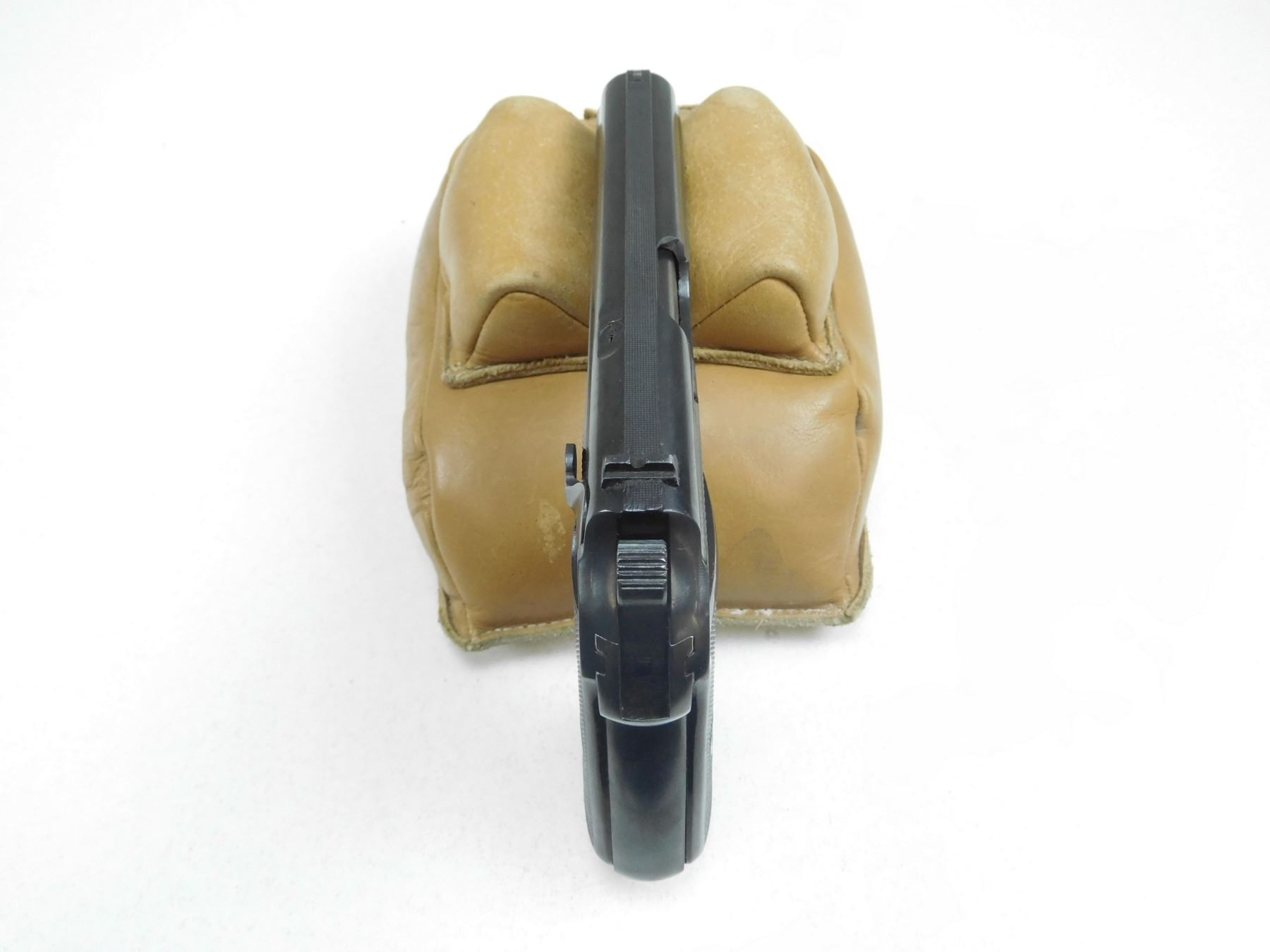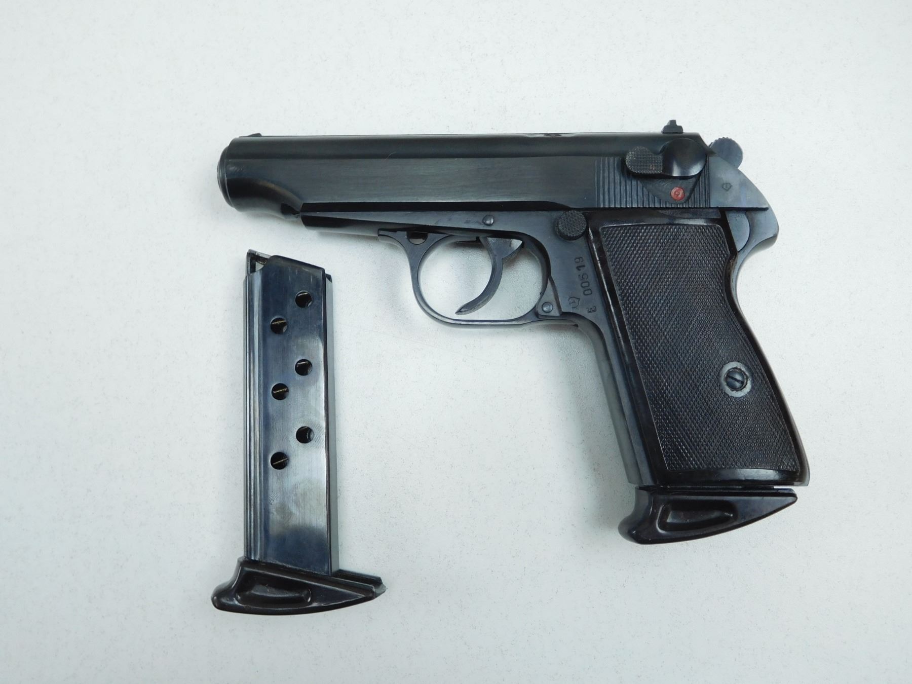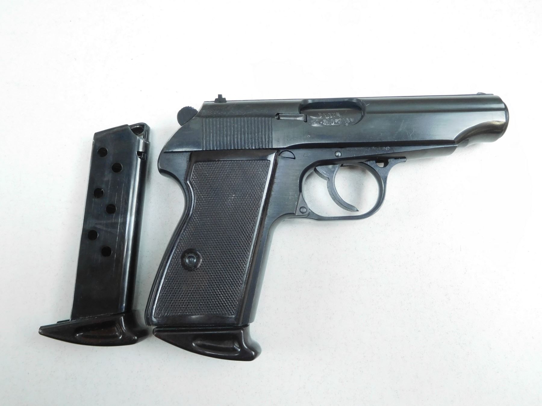 WALAM/FEG , MODEL: PP , CALIBER: 380 AUTO , COMES WITH 2 MAGAINES, FIXED NOTCH AND BLADE SIGHT, CHECKERED PLASTIC GRIPS, COCKING INDICATOR, MATCHING SERIAL #'S RE-BLUE, EXCELLENT BORE , BARREL LENGTH: 102MM , SERIAL # E00519 , STOCK # 2168 , CONDITION: 7/10 , CLASS: CANADIAN PROHIBITED CLASS