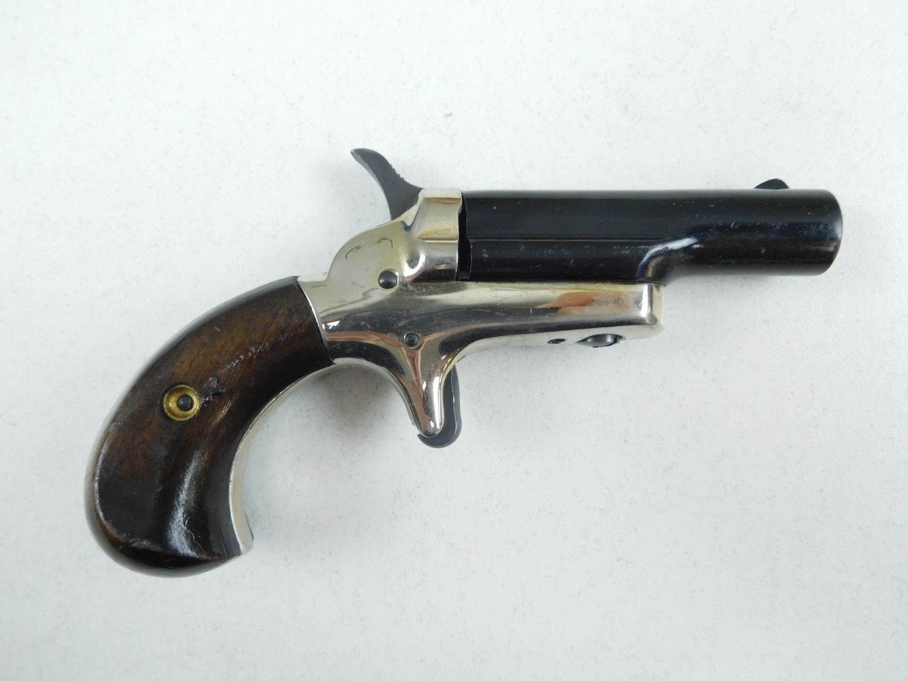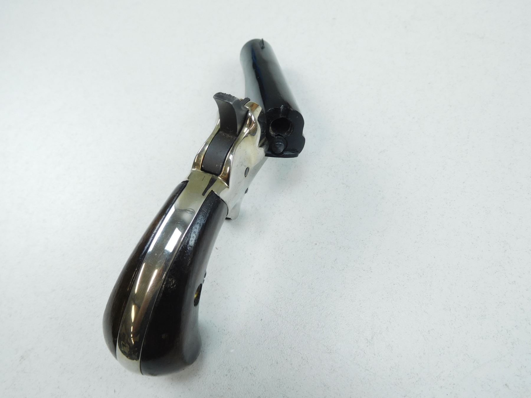 BUTLER , MODEL: DERRINGER , CALIBER: 22 SHORT , FIXED NOTCH AND BLADE SIGHTS, WOODEN BIRDS HEAD GRIPS, NICKEL AND BLUE FINNISH, EXCELLENT BORE , BARREL LENGTH: 63MM , SERIAL # 15668 , STOCK # 2175 , CONDITION: 9/10 , CLASS: CANADIAN PROHIBITED CLASS
