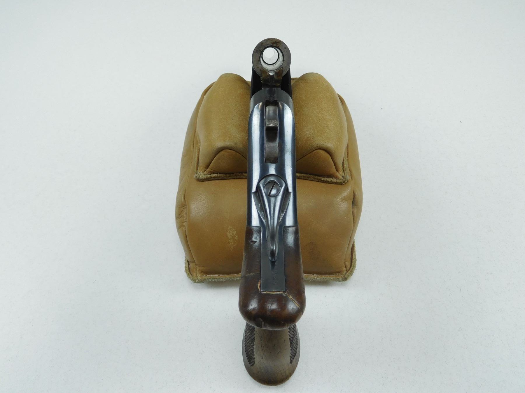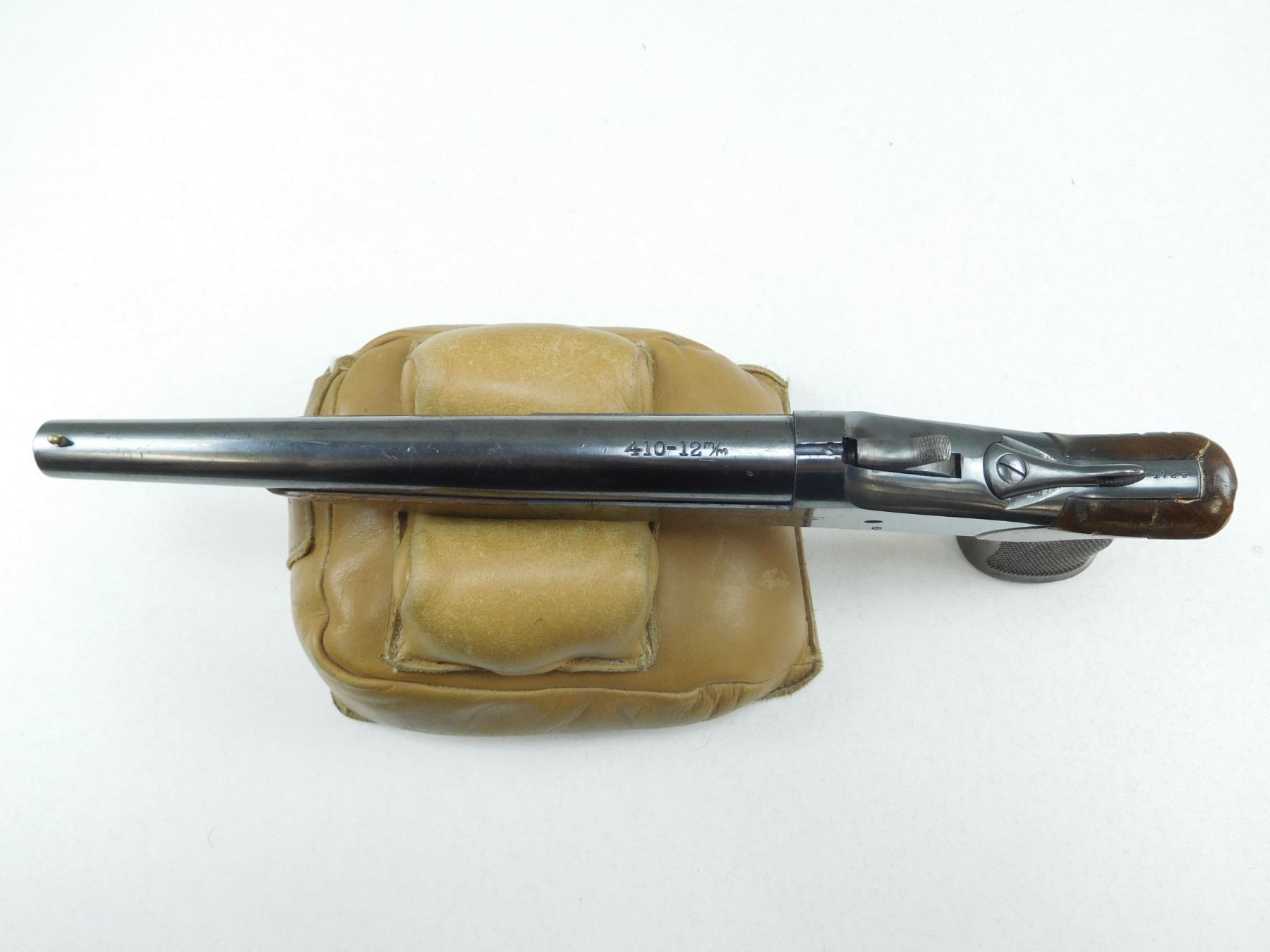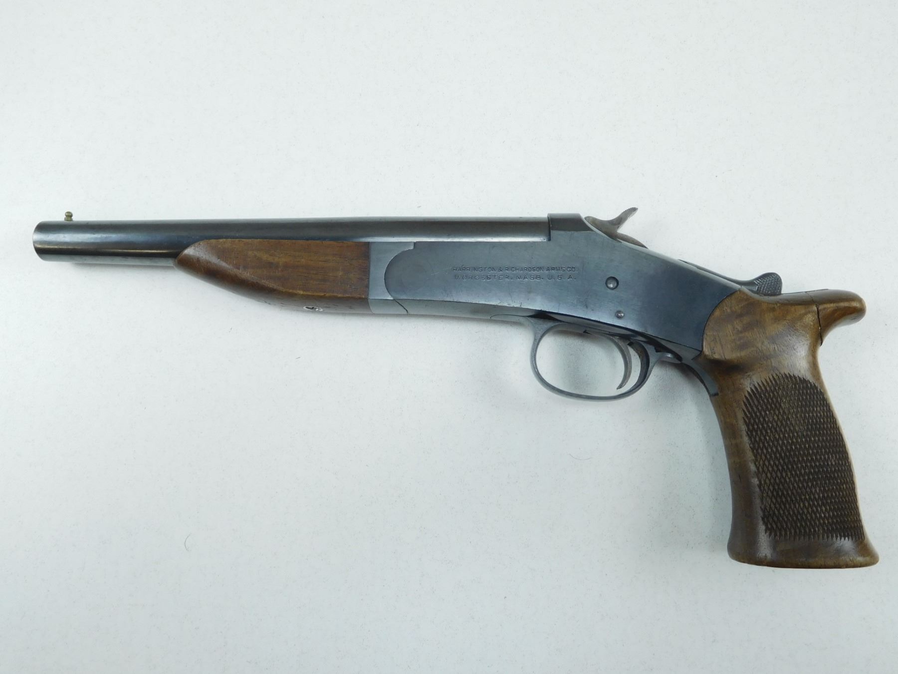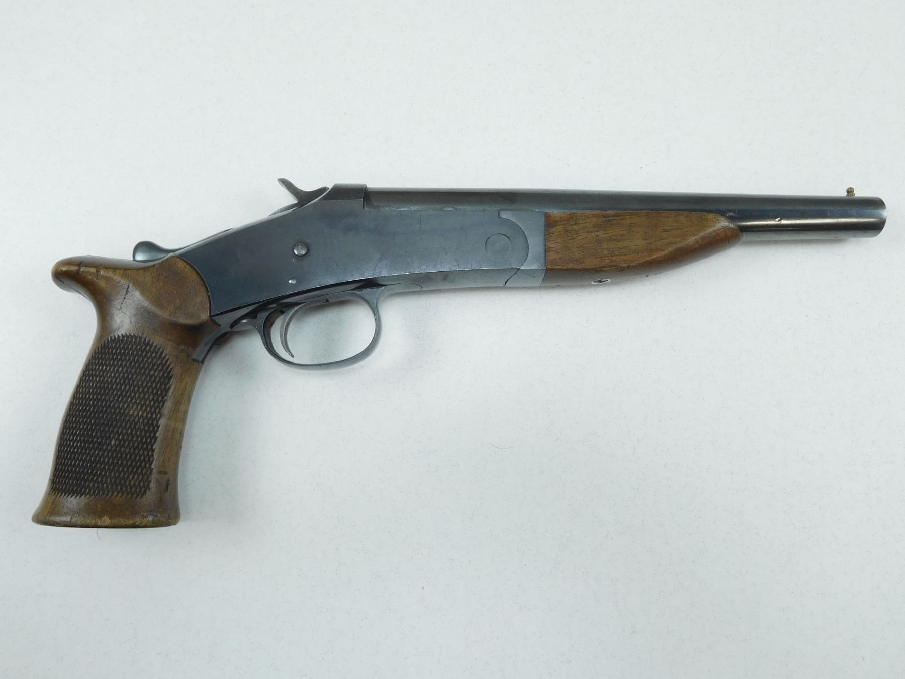 HARRINGTON & RICHARDSON , MODEL: HANDY GUN , CALIBER: 410 GA X 2 1/2" , GOOD BORE, TAIL ON THE WOODEN PISTOL GRIP HAS BEEN CRACKED AND REPAIRED, NOTCH AND BEAD SIGHTS, CASE COLOURED HAMMER AND TRIGGER, BRIGHT BLUE FINISH , BARREL LENGTH: 203MM , SERIAL # 1729 , STOCK # 2681 , CONDITION: 7/10 , CLASS: CANADIAN RESTRICTED CLASS
